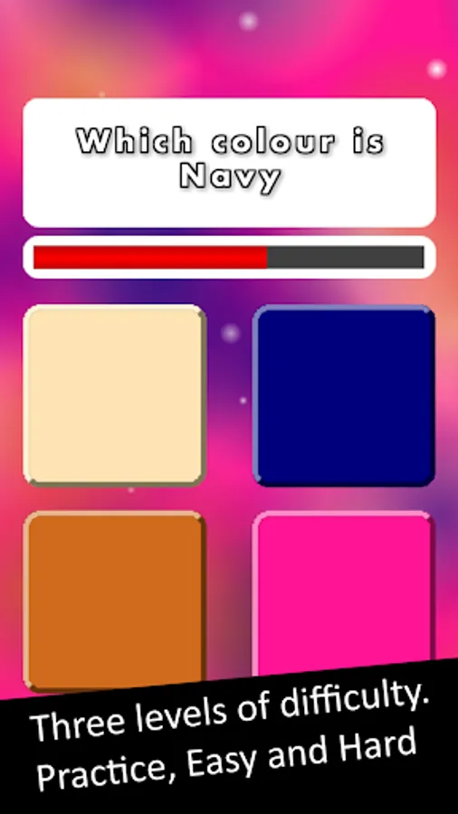 Colour Name Quiz Advance has 3 levels of difficulty. Practice, where wrong answers are eliminated, Normal, and Hard, where possible answers are all taken from groups of similar colors.