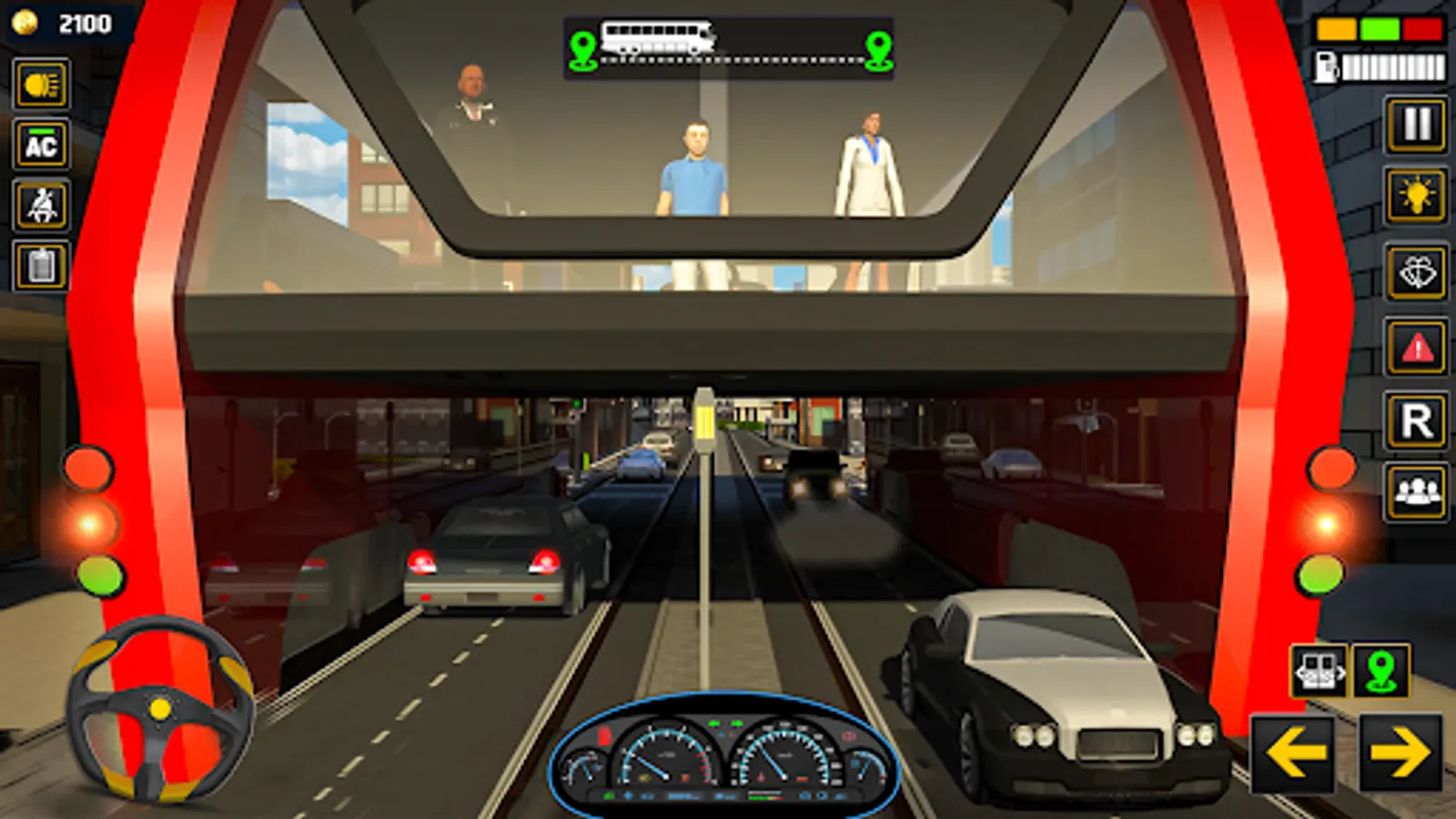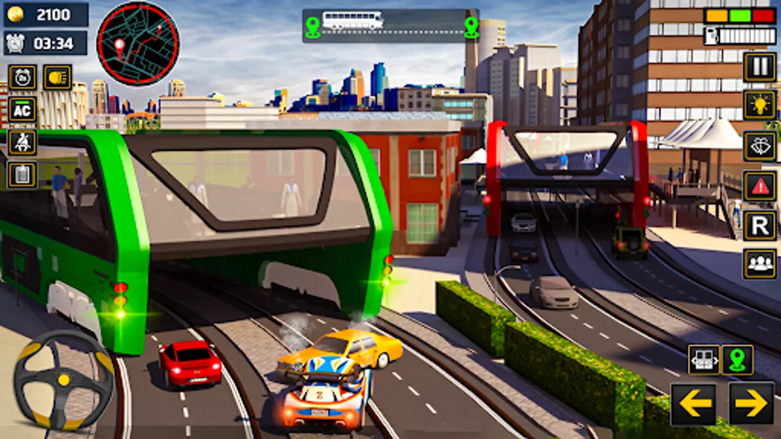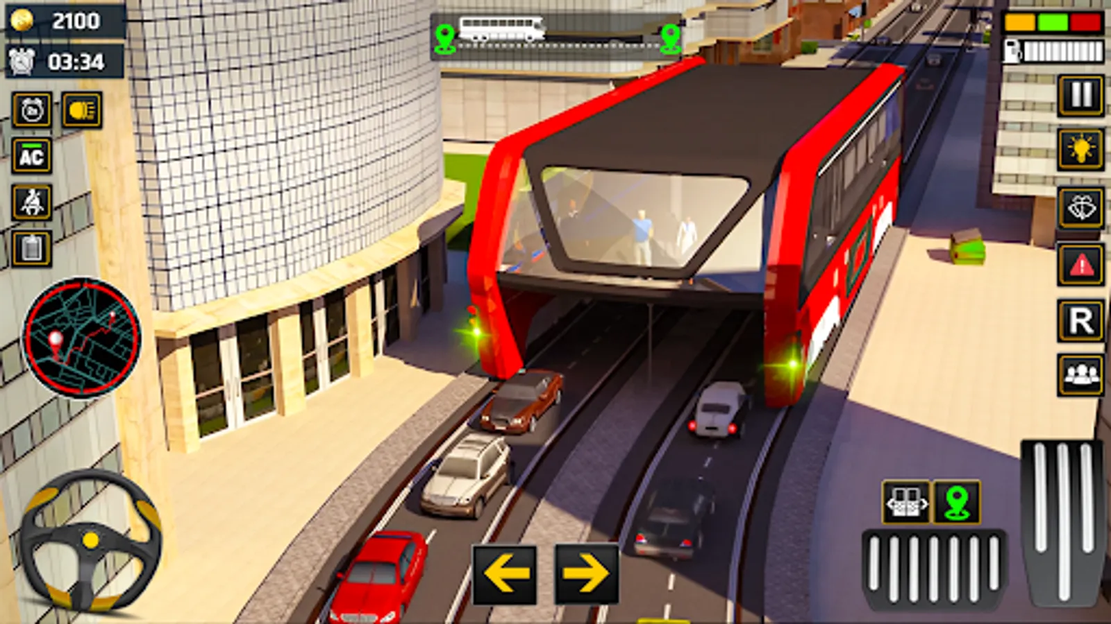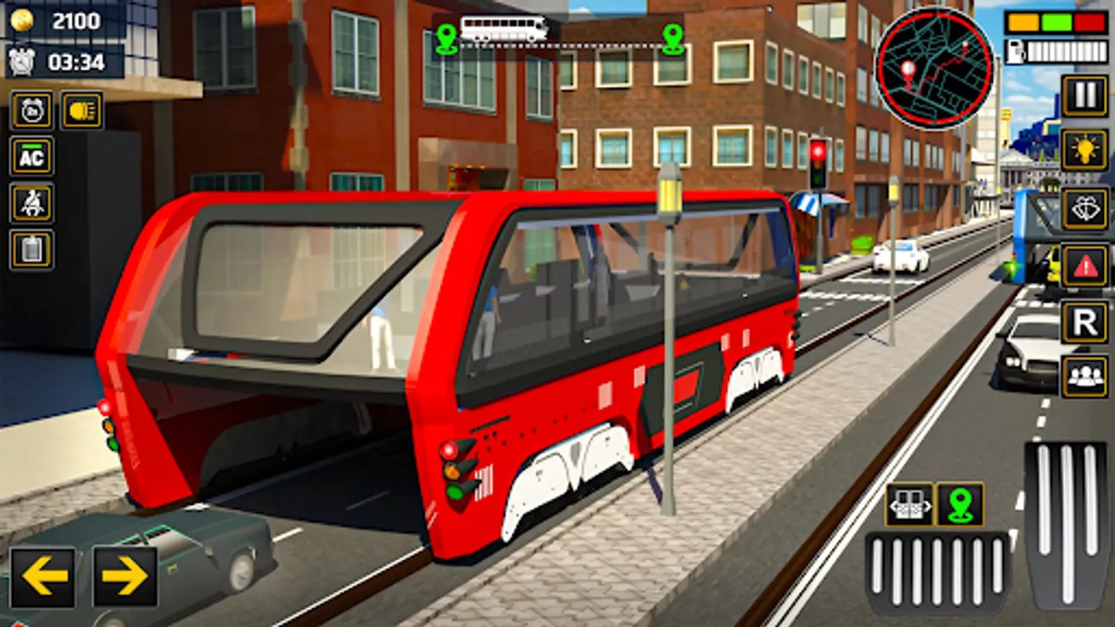 Straddling China bus is the future of public transportation in city rush. Hop into the high tech transit bus as real driver and guide it through city routes transporting citizens and tourists. This guided bus straddles above road traffic and transport passengers within city destinations. Get inside futuristic bus control room to maneuver gigantic vehicle. Pull race lever with full throttle for fast city bus driving. Straddling bus is powered by electricity so no need to refuel from gas stations. This modern china bus drives 10 feet above ground level so that city traffic flows beneath it without collisions. To become a real bus driver follow traffic rules and stop at red light to avoid car accidents. The giant city express bus has big passenger compartments to transport 300 citizens at once. Pick & drop passengers on board to transit bus stops.