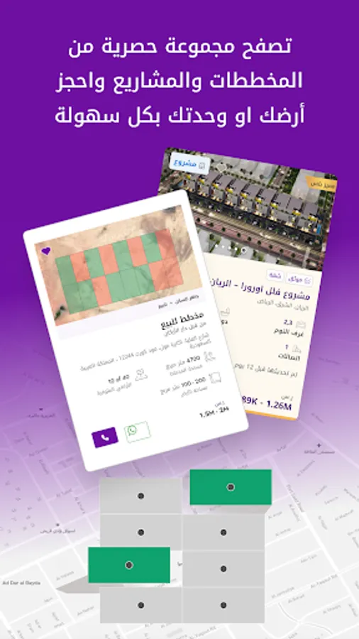 Projects: Learn about a distinguished group of exclusive projects offered by elite real estate developers in the Kingdom of Saudi Arabia, and book any apartment, duplex or villa offered for sale, from the application with ease using your bank card.