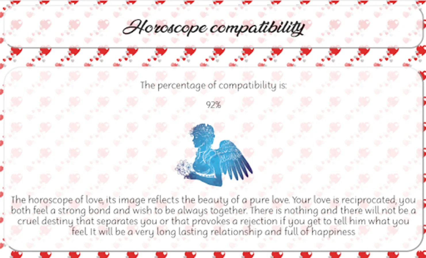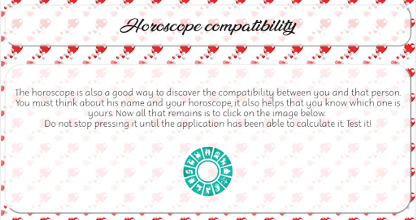 * Compatibility of horoscopes: horoscopes always influence luck or destiny in love, therefore you can also observe the degree of possibility.