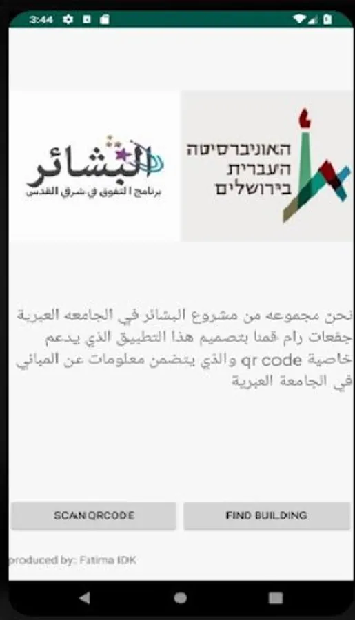 نحن مجموعه من مشروع البشائر في الجامعه العبرية جفعات رام قمنا بتصميم هذا التطبيق الذي يدعم خاصية qr code والذي يتضمن معلومات عن المباني في الجامعة العبرية