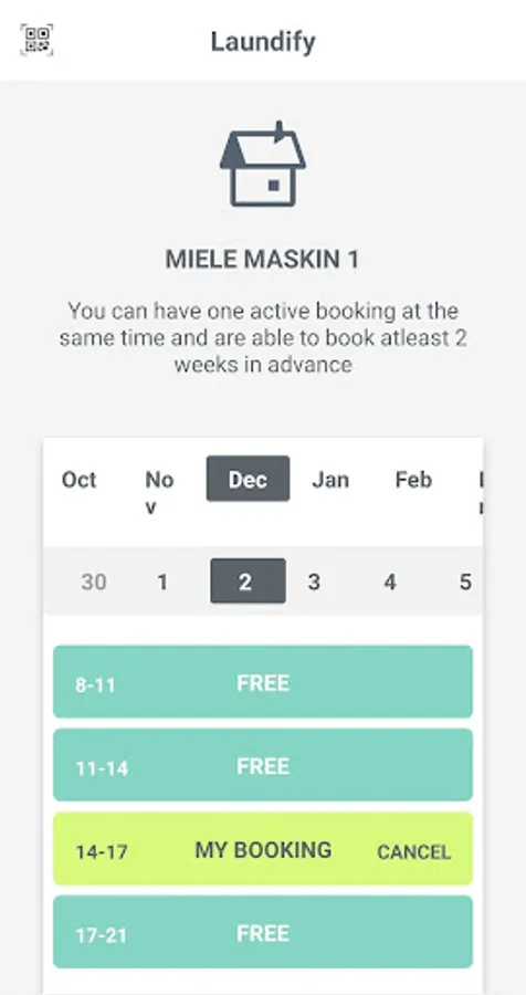With Laundify you simply connect to a laundry room by scanning it's QR code. Once that is done, you are ready to start booking time slots.
