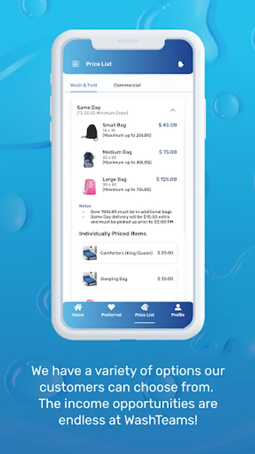 WashTeams has created a robust offering to fit your budget. No weighting, no price per pound, just a simple price per bag size.