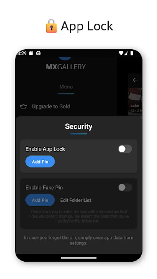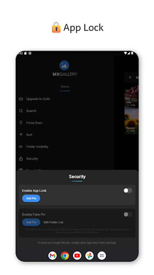 App lock enables you to protect your gallery from the wrong hands. Our primary focus has been on privacy so we have also added fake lock feature that lets you add a secondary lock pin that will load only those content which you want the gallery to load.