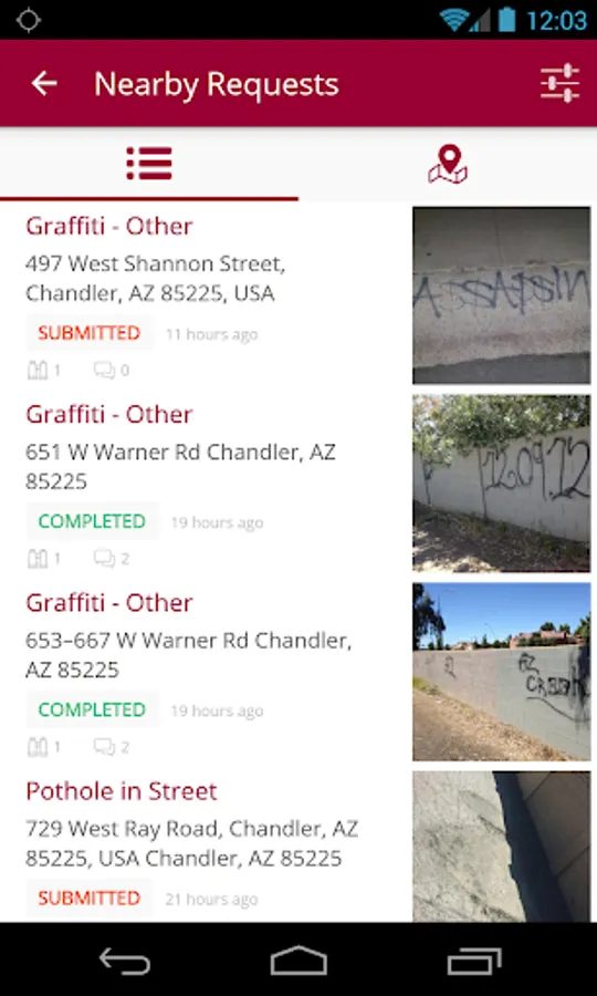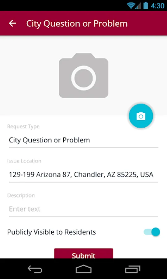 Chandler Public Stuff allows service requests (potholes, noise complaints, dangerous conditions, etc) to be submitted directly to the your local government, where it will be instantly routed to the correct administrator in the appropriate department. This means your service requests will be responded to quickly and efficiently, and you'll be notified the instant they are resolved!