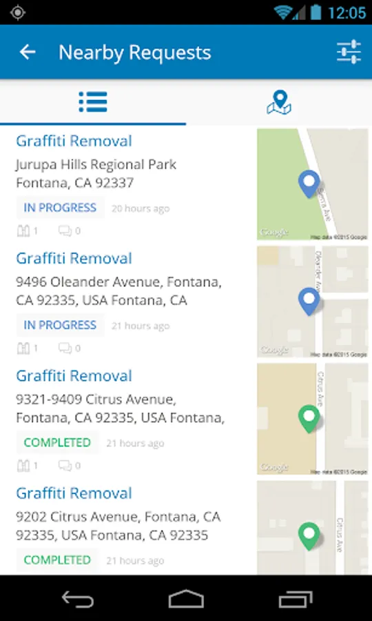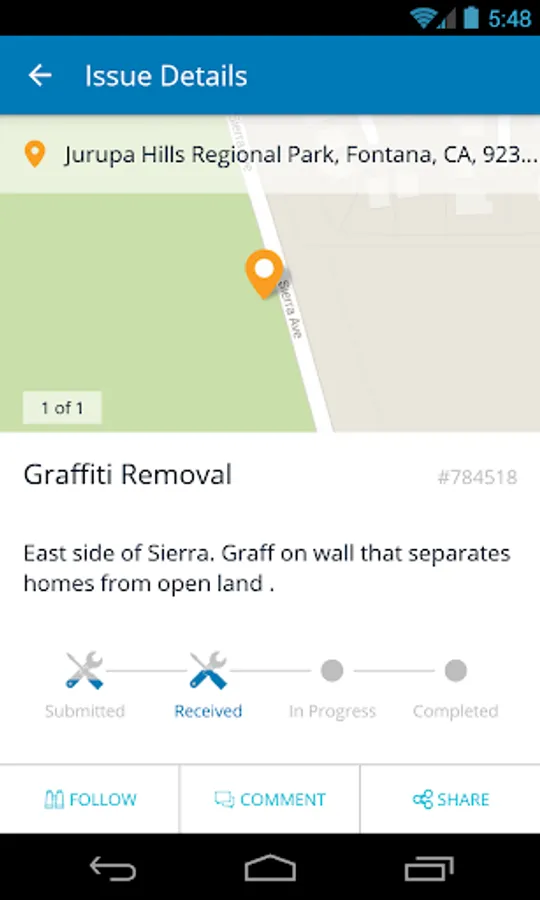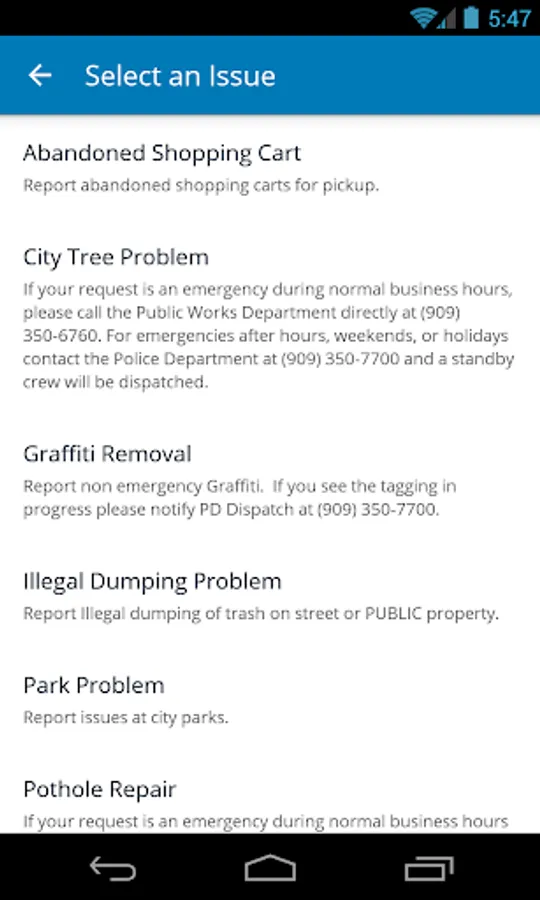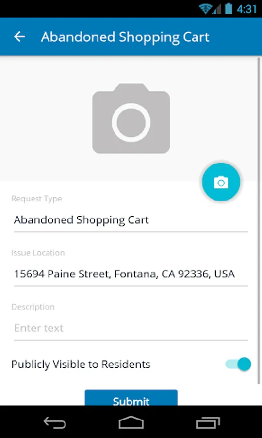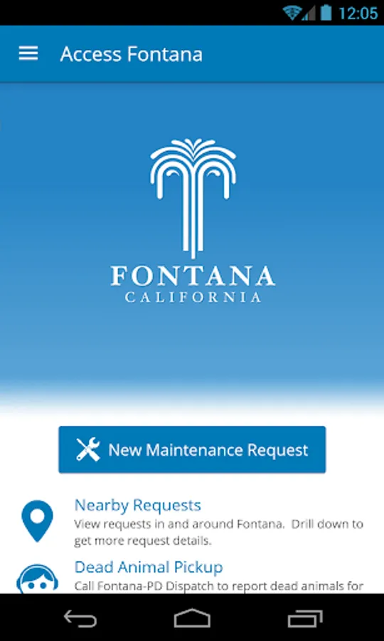 Citizens in the City of Fontana can now submit service requests directly through their Android device or the City’s website that will automatically get routed to the correct department for proper handling. Through a partnership with PublicStuff, graffiti and potholes reported will go directly to the Public Works department and immediately create a work order. Once completed, you will be notified through your phone or email that the work is complete. Dead animal pickup requests will be routed to Police Dispatch and an Animal Services Officer will be sent out to remove it. Note: You will not receive a notification when the dead animal has been removed. Additional service request types will be added in the future.