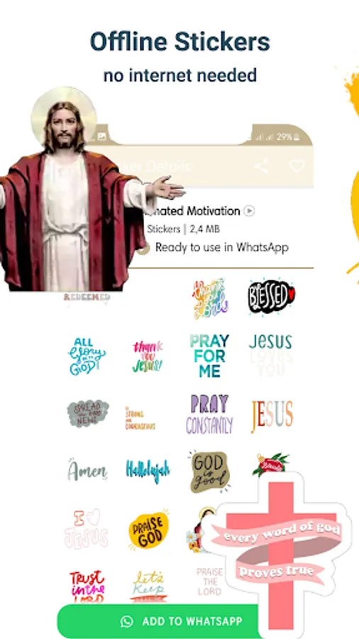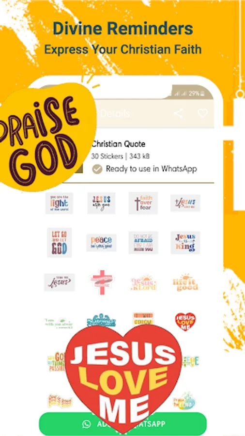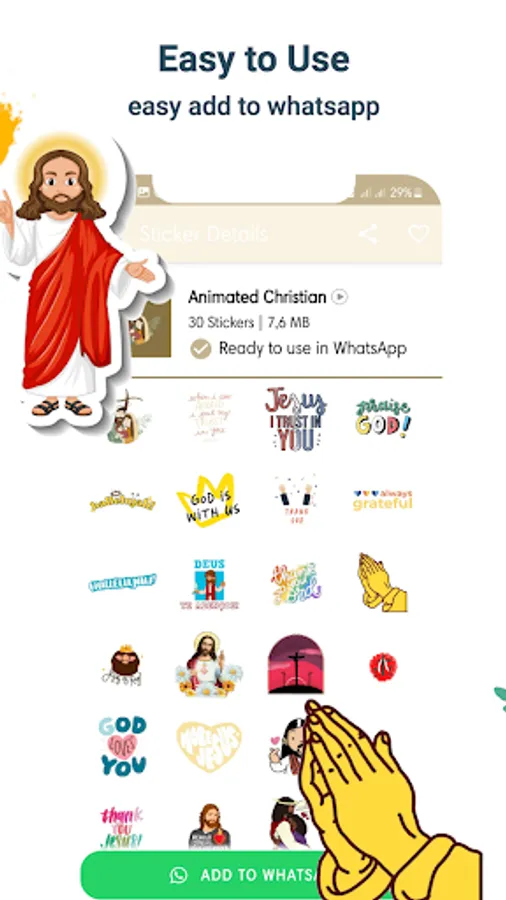 WASticker - Animated Christian provides stickers in a variety of formats, including animated GIFs and vibrant illustrations. These dynamic stickers add an extra touch of emotion and creativity to your conversations, enabling you to communicate your Christian values with style and enthusiasm.