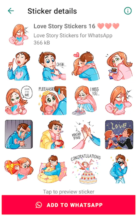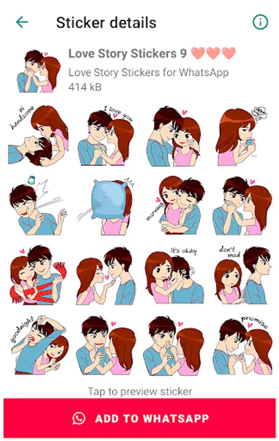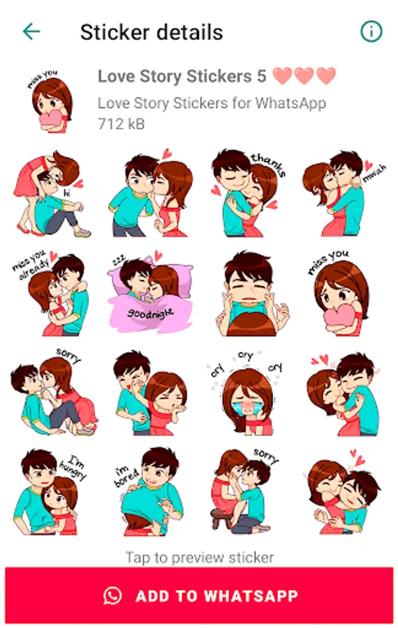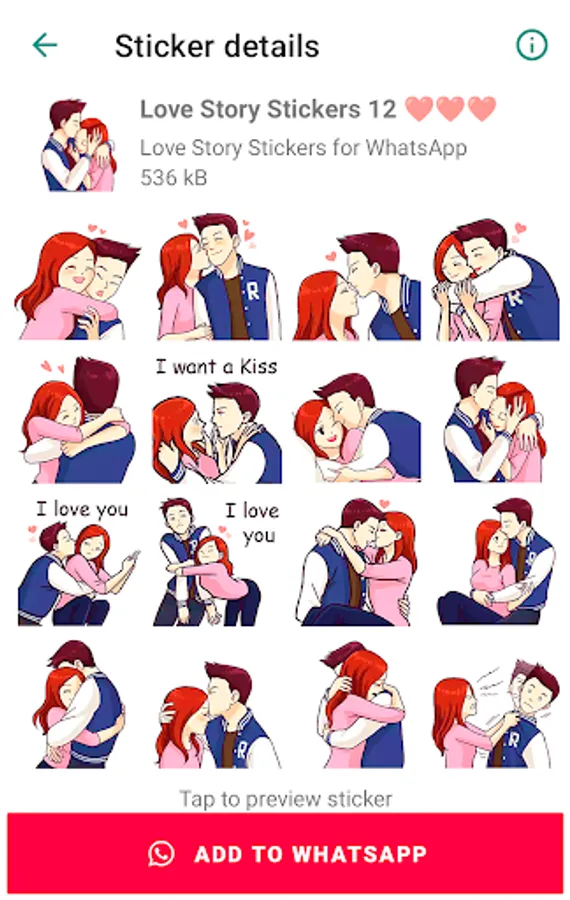 Includes new stickers that you can send to your loved one. Contains the most famous love stickers like “Love story”, “I Love you”, “Romantic couple”, “Love messages”, “Hot kiss”, “Love quotes”, “Hearts emoji”, “Sexy kiss”, “WAsticker love is” and cute love stickers for WhatsApp.