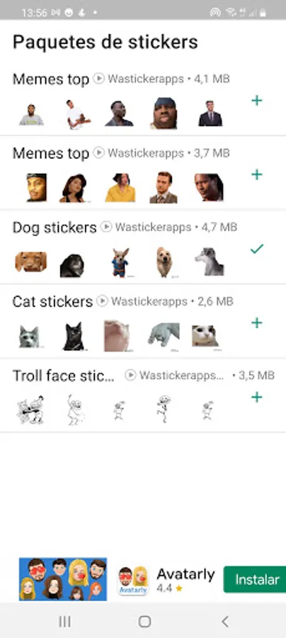 Access the packs of stickers and click on the icon "+" add stickers for whatsapp, then you will be able to access the animated stickers of memes within your chat.