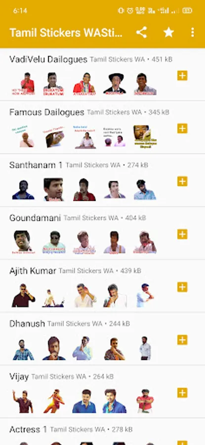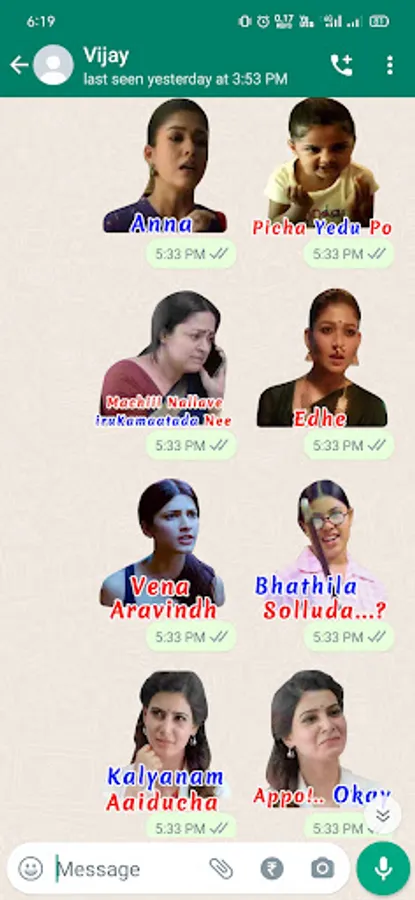 Use stickers for WASticker and add tamil stickers, vadivelu Stickers, tranding tamil stickers, 3D Stickers, tamil actress stickers, tamil famous dailogues and tamil reactions stickers to your chat.