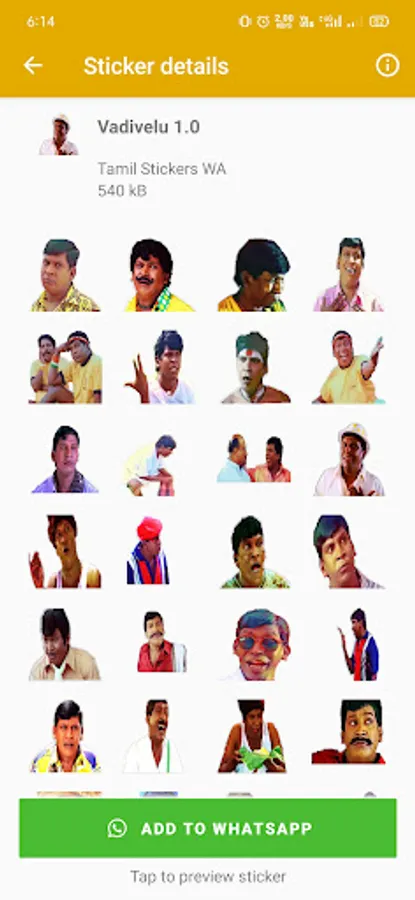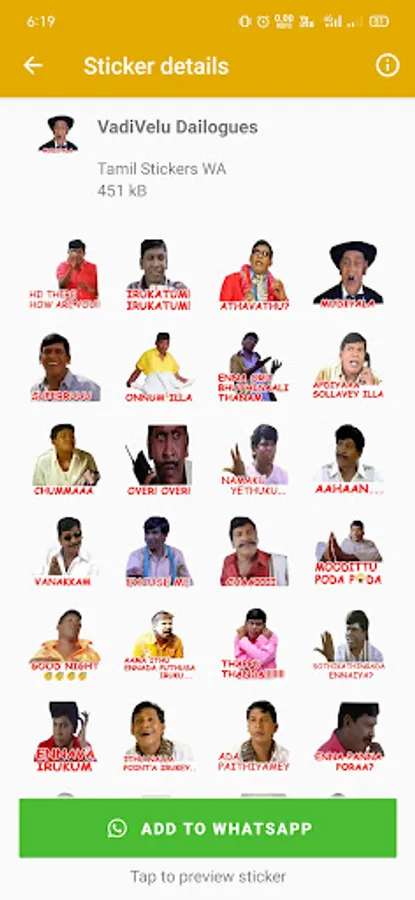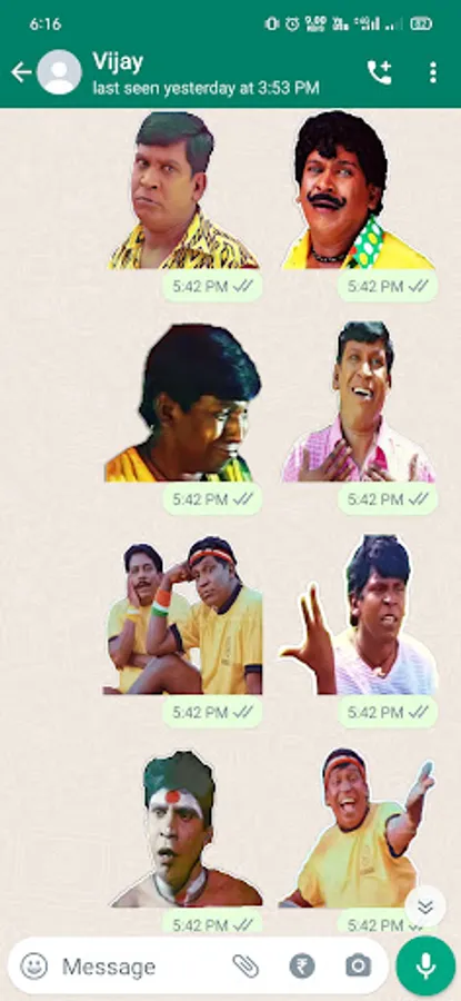 Use this free WASticker tamil stickers app and add new stickers packs of vadivelu stickers, tamil dailogues stickers to send funny tamil stickers to your friends. Also, use santhanam tamil stickers, good morning tamil stickers and good night tamil stickers to greet your friends