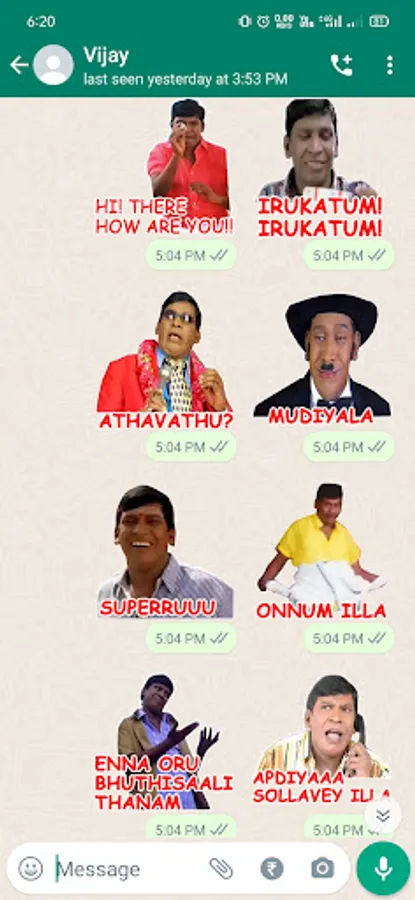 Expressive your emotions with Tamil stickers, Vadivelu fun stickers, Sirippu Tamil Stickers, Tamil Actors Stickers, send stickers to your friends and family to enjoy the fun filled chat experience. You can use these tamil stickers for replays to your chat, stories, and groups.
