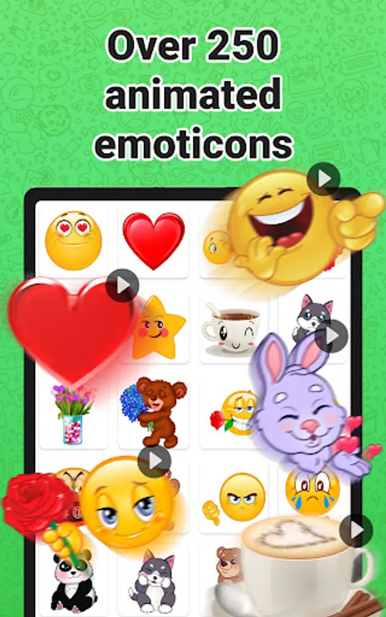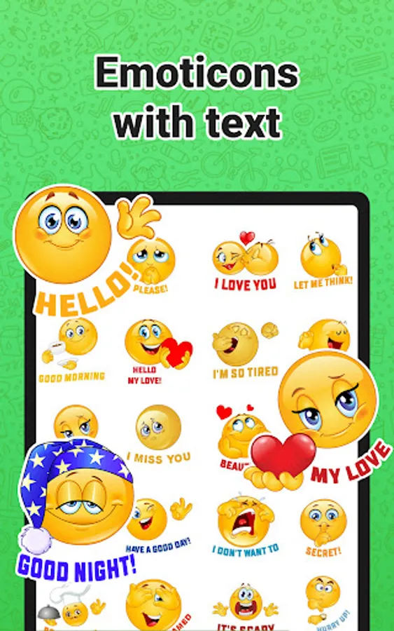 The app has nice and funny emoji in many variations. We have packs with children, hearts, gifts, cats 🐱, dogs 🐶 and happy birthday, 🌷 International Women's Day 🌷 stickers. Also, you can find everyday stickers like good morning, and good night, besides, for some holidays (🌷 International Women's Day 🌷 2023). Wasticker will delight you and your friends for a variety of reasons. You will find a large selection of nice love-themed packs. Lovely roses and romantic stickers will please your loved ones.