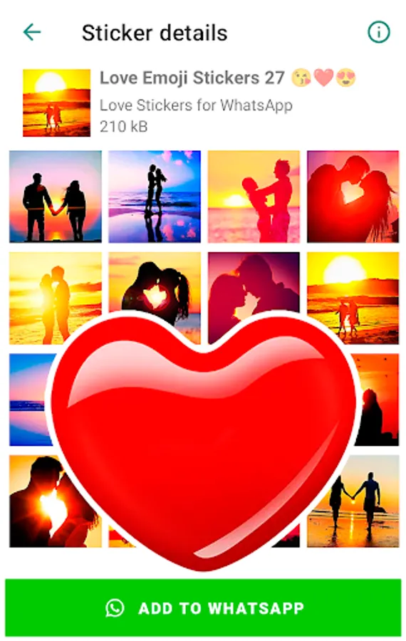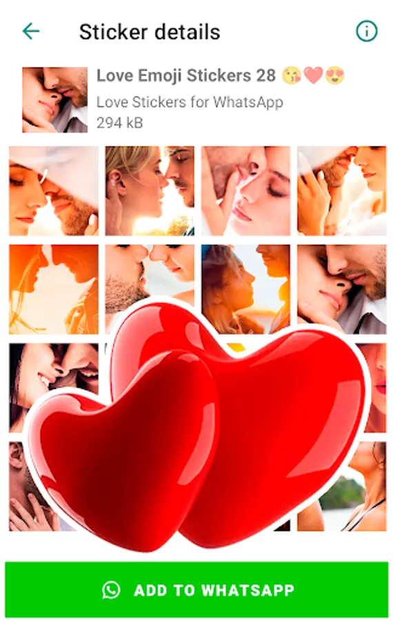 Make your chat most romantic and beautiful with new sticker packs: “Hot kiss”, “I love you”, “Love story”, “Romantic couple”, “Love quote”, “Hearts emoji”, “Sexy kissing”, “Broken heart” and other cute emoji in love stickers for WhatsApp.