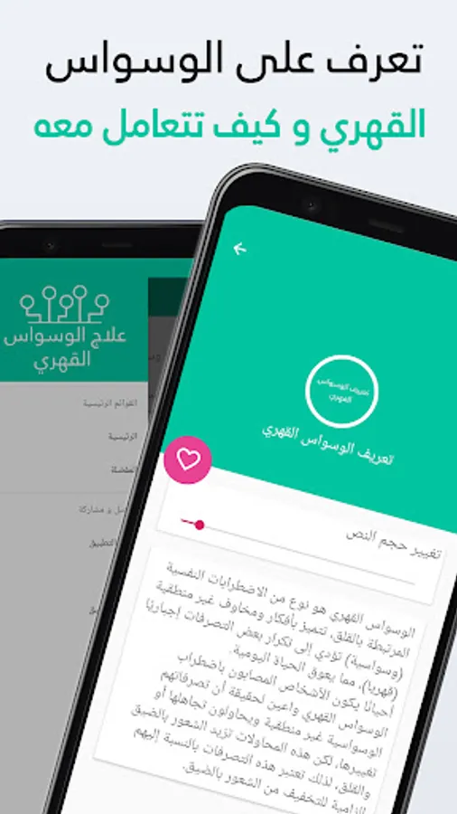 We offer you this free application that keeps you from wasting your precious time in searching various forums and sites, most of which are without result, so we specially made an application for you that helps you identify OCD and its types and the damages that may result from it and some effective ways to treat it, and The application also includes some methods of treatment, whether in the Holy Qur’an, supplications for healing, some herbal remedies and instructions for the person suffering from obsessive-compulsive disorder, as well as how to deal with the person with it. The reasons leading to it and misconceptions about it and the resulting diseases, psychological and physical from negative thoughts, must be mentioned. Diseases and others, and how to maintain your mental health and how to eliminate, control and manage obsessive-compulsive disorder.