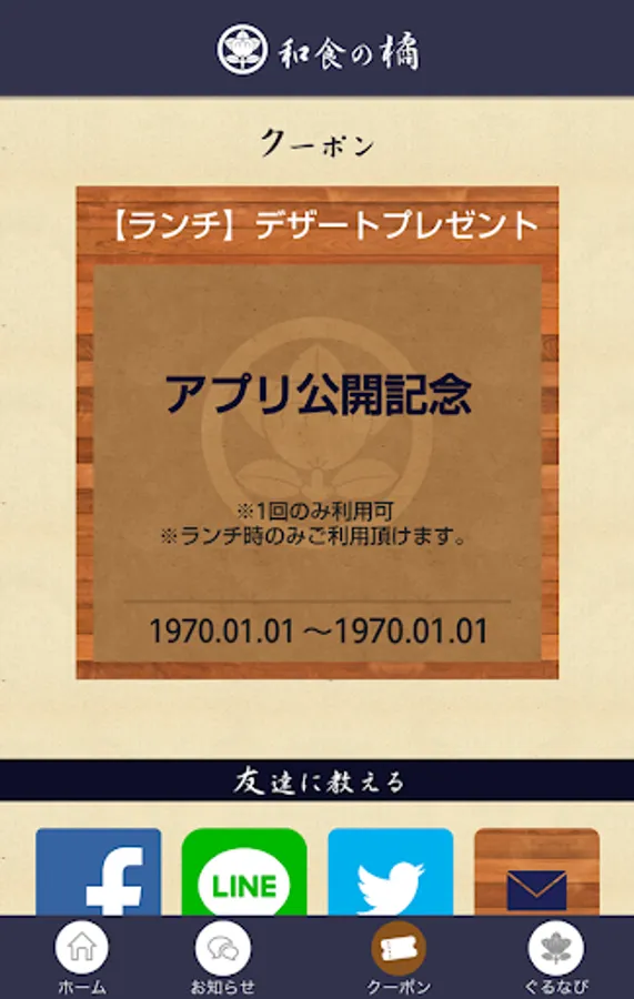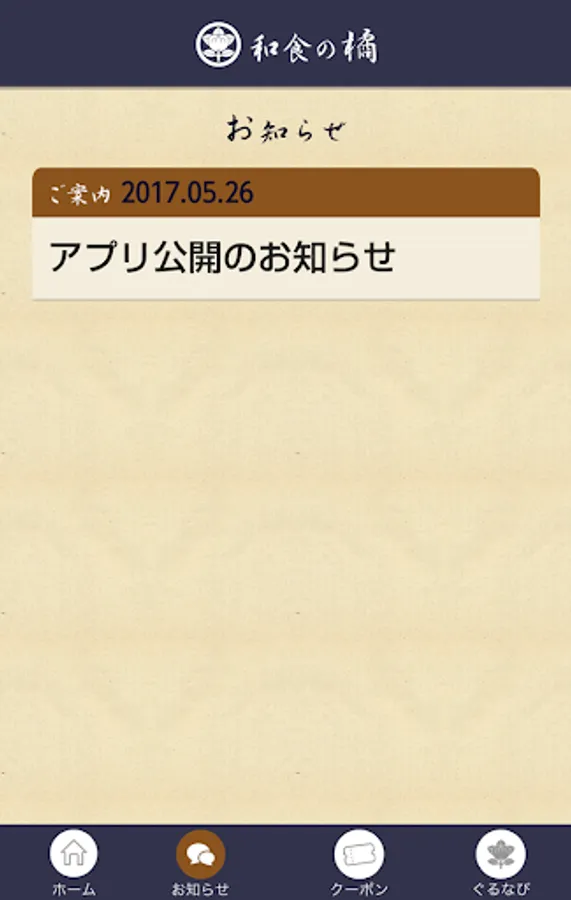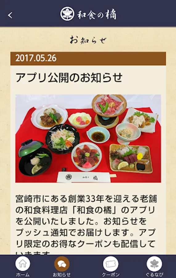 このアプリでは、【和食の橘(わしょくのたちばな)】の最新の情報をいち早くお届けし、