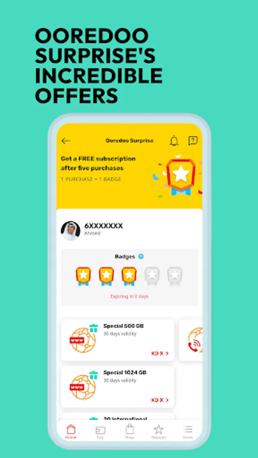It gives you the ability to Upgrade to 5G internet, Subscribe to Roaming and International services easily with one click and no commitments needed. You can also manage your Nojoom Points redemptions and check the latest Nojoom Deals. Don’t miss out on the Incredible Offers of Ooredoo Surprise.