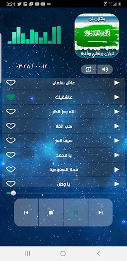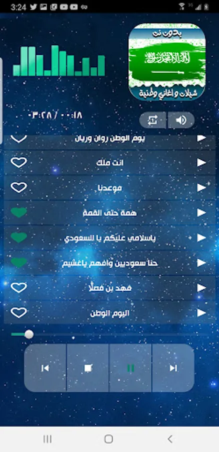 It includes songs and shishas of the Saudi National Day for a group of the most prominent stars of Saudi art, such as Muhammad Abdo, Rashid Al Majid, Muhammad bin Gharman and others... The shilat is characterized by high audio quality and the ability to hear it in the background with the automatic change of these renewed shishas.