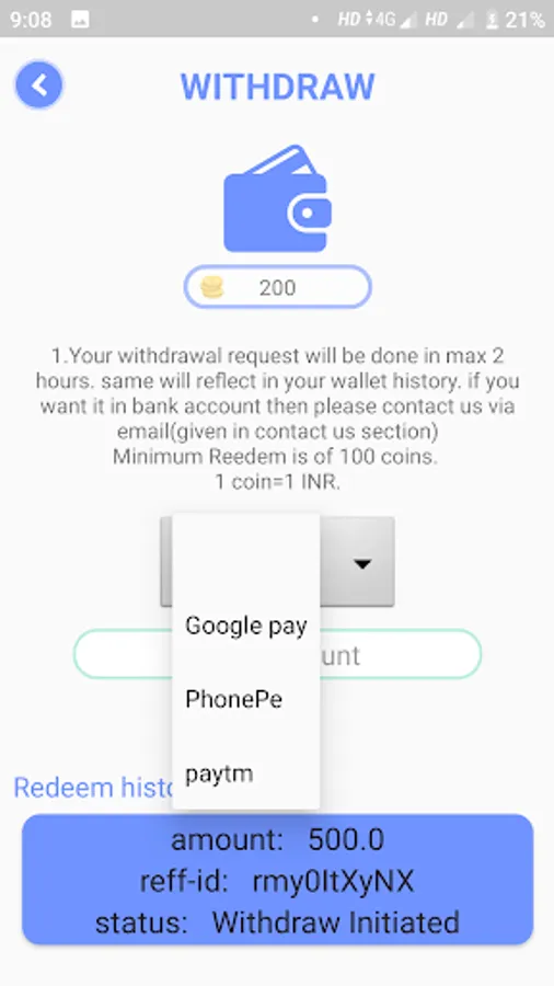 User can withdraw their wallet coins into their Paytm , Google Pay or Phone Pe Account Also.