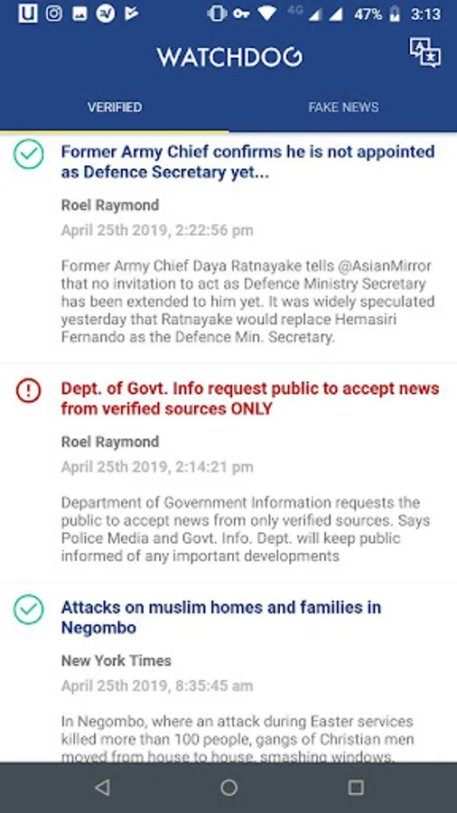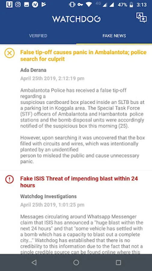 Watchdog is a free mobile application that aggregates relevant news, alerts and warning messages to the public. The system is updated by the collaborative efforts of a group of individuals and organizations that are working to establish the credibility of information by sorting them out as either facts or rumors.