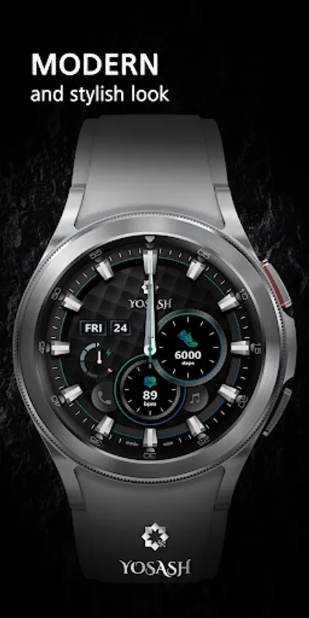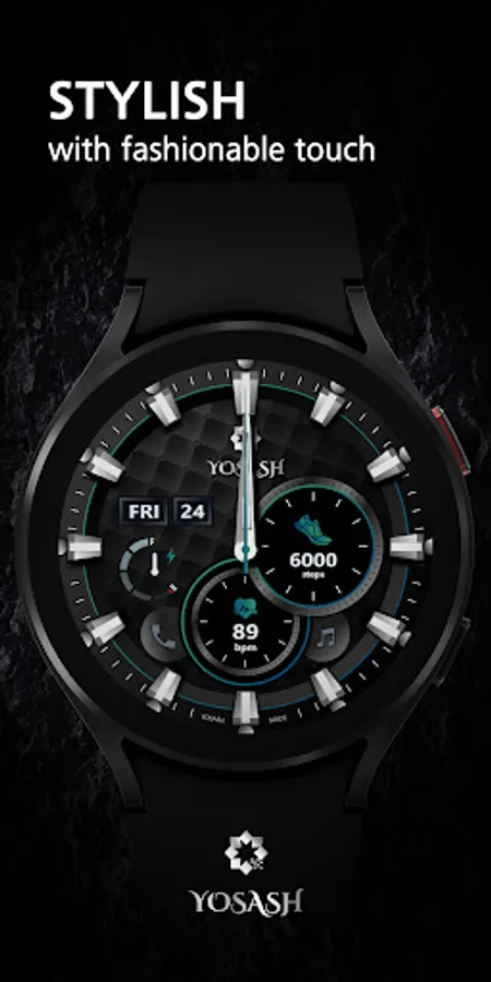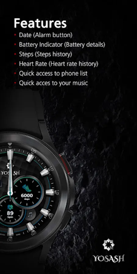 Analog watch face, fashionable, stylish, and full functions with Date, Battery indicator, steps count, and heart rate measurement with alert button, battery details button, steps details button, and heart rate details button. Quick access to phone book and your music.