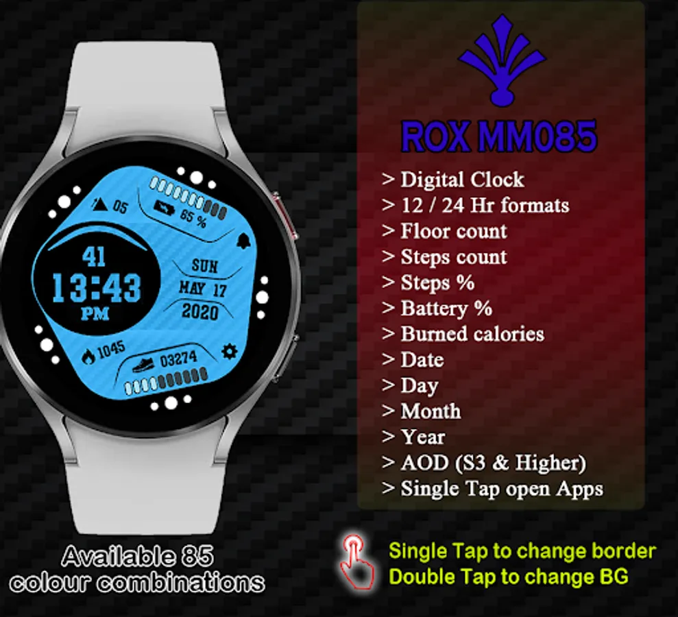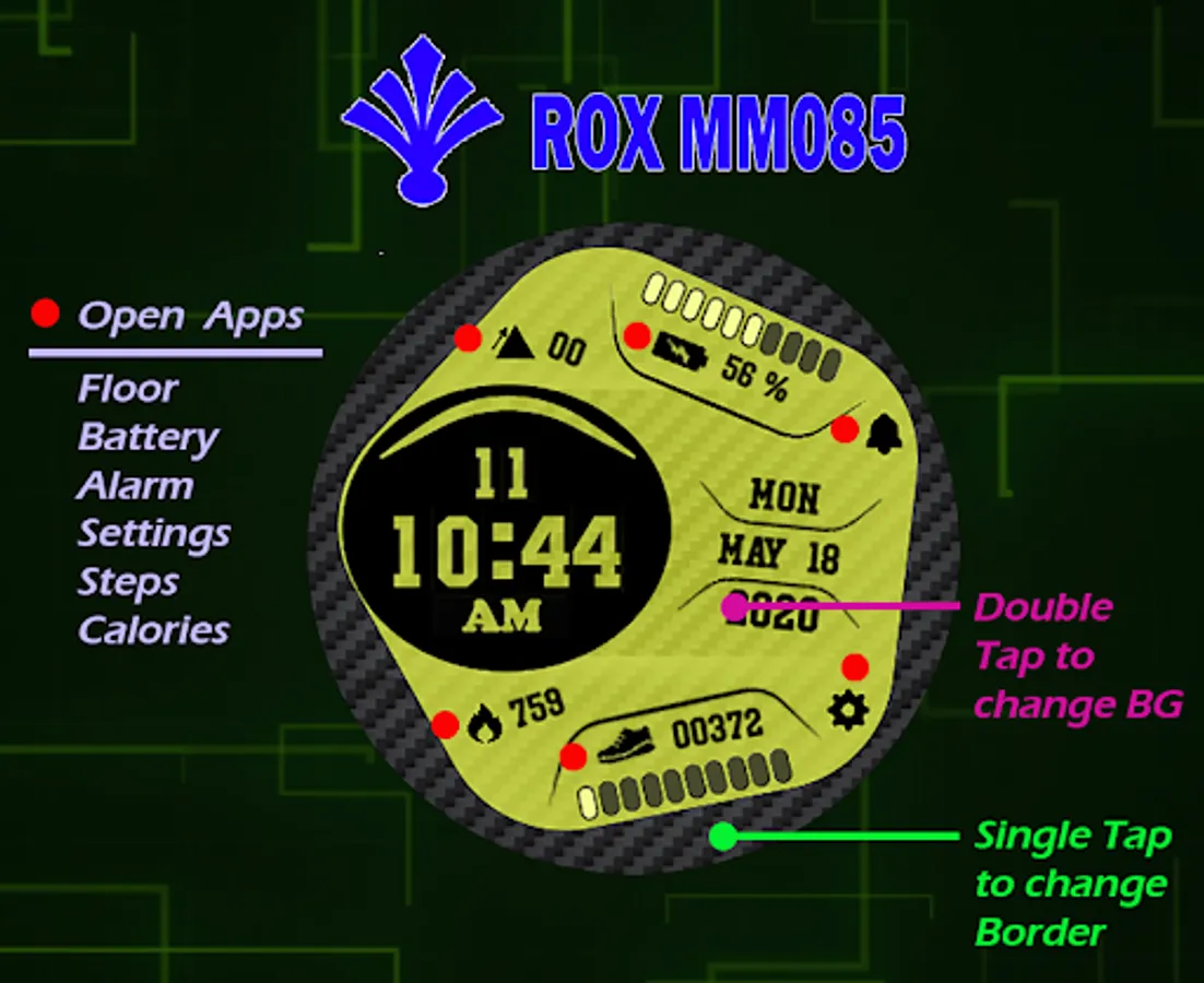 > Single Tap to open Apps (Alarm, Settings, Calories, Steps, Battery & Floors).