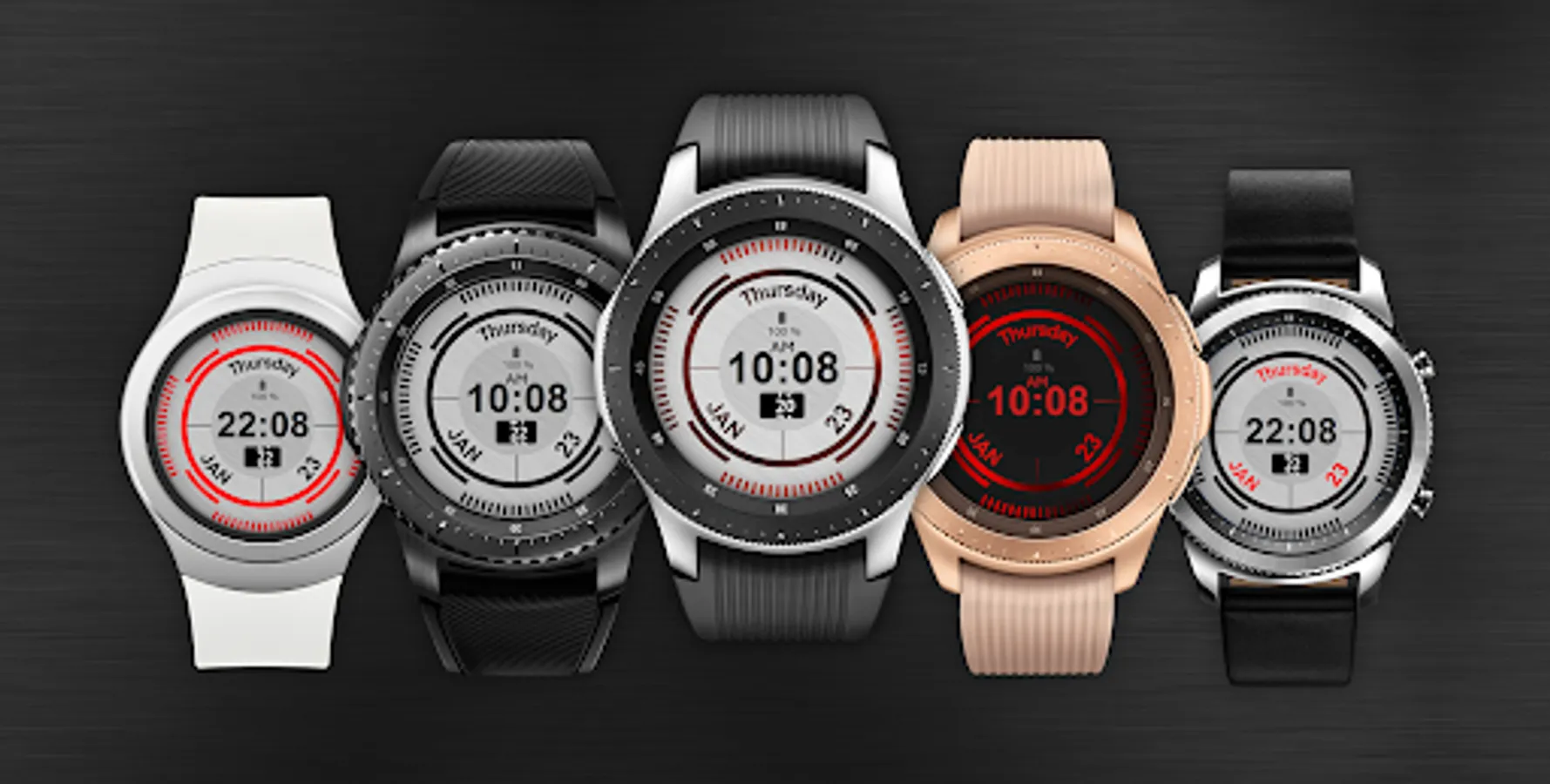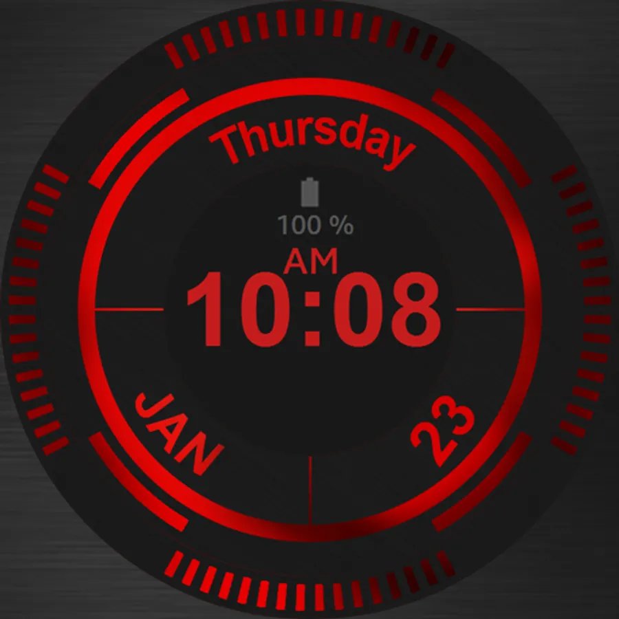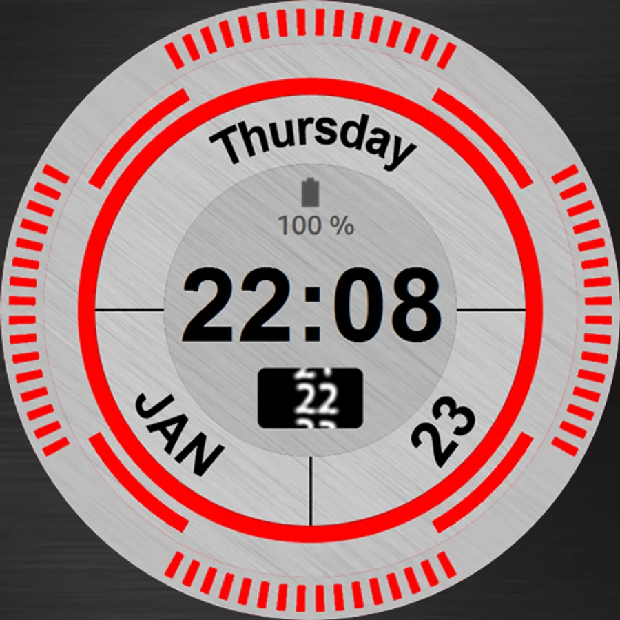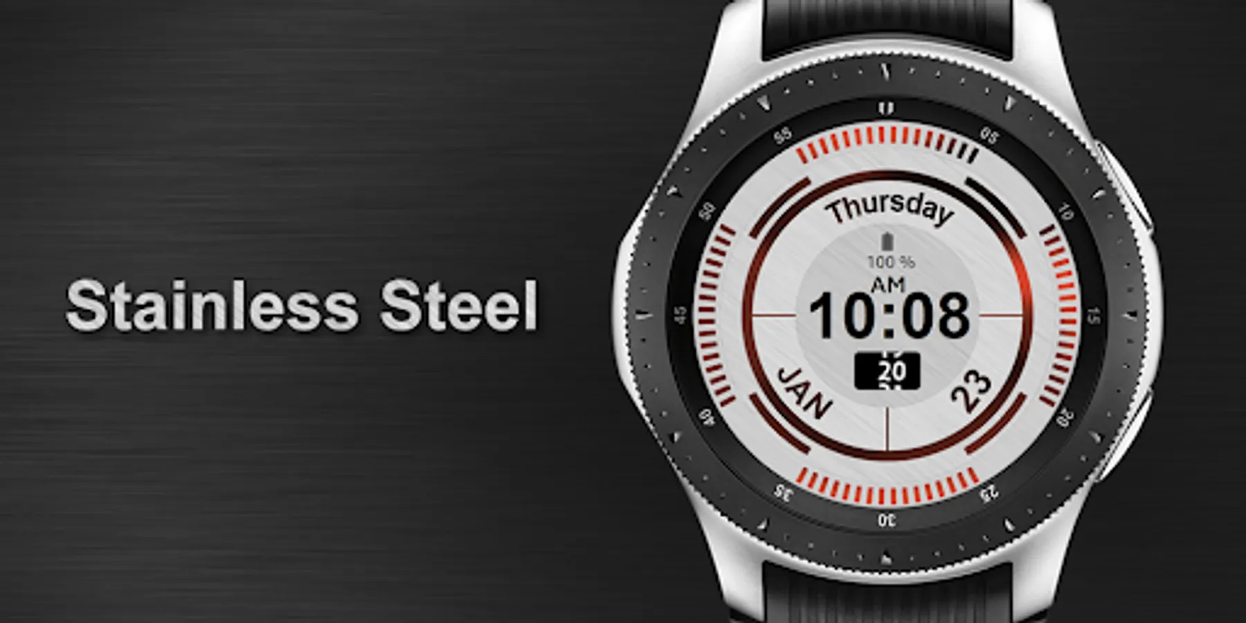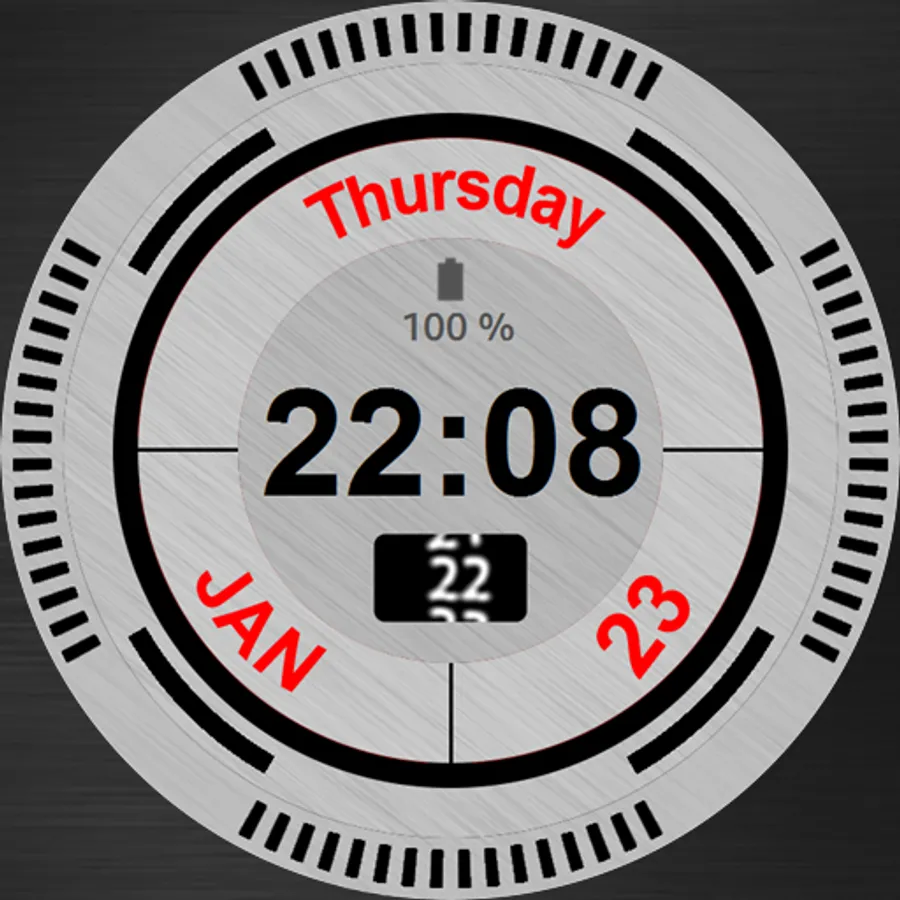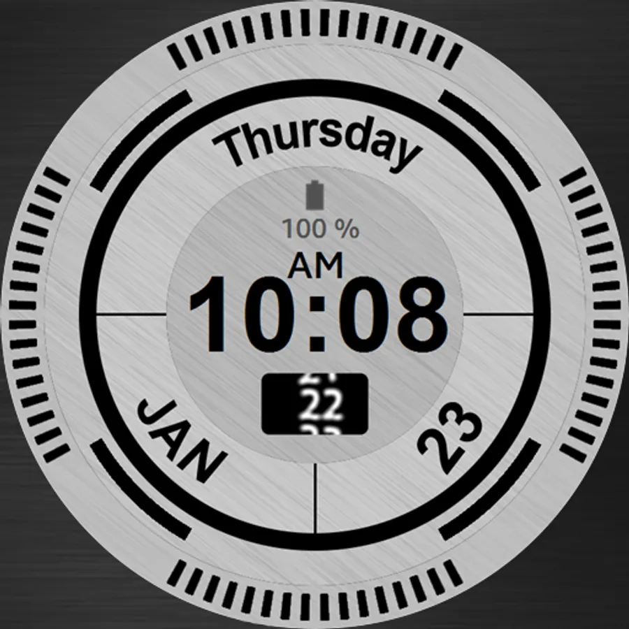 A clean, modern watch face design for Wear OS with a brushed stainless steel look. Choose between an animated backlight, 7 fixed backlight effects, or none at all. Compatible with Samsung Galaxy Watch 4 series.