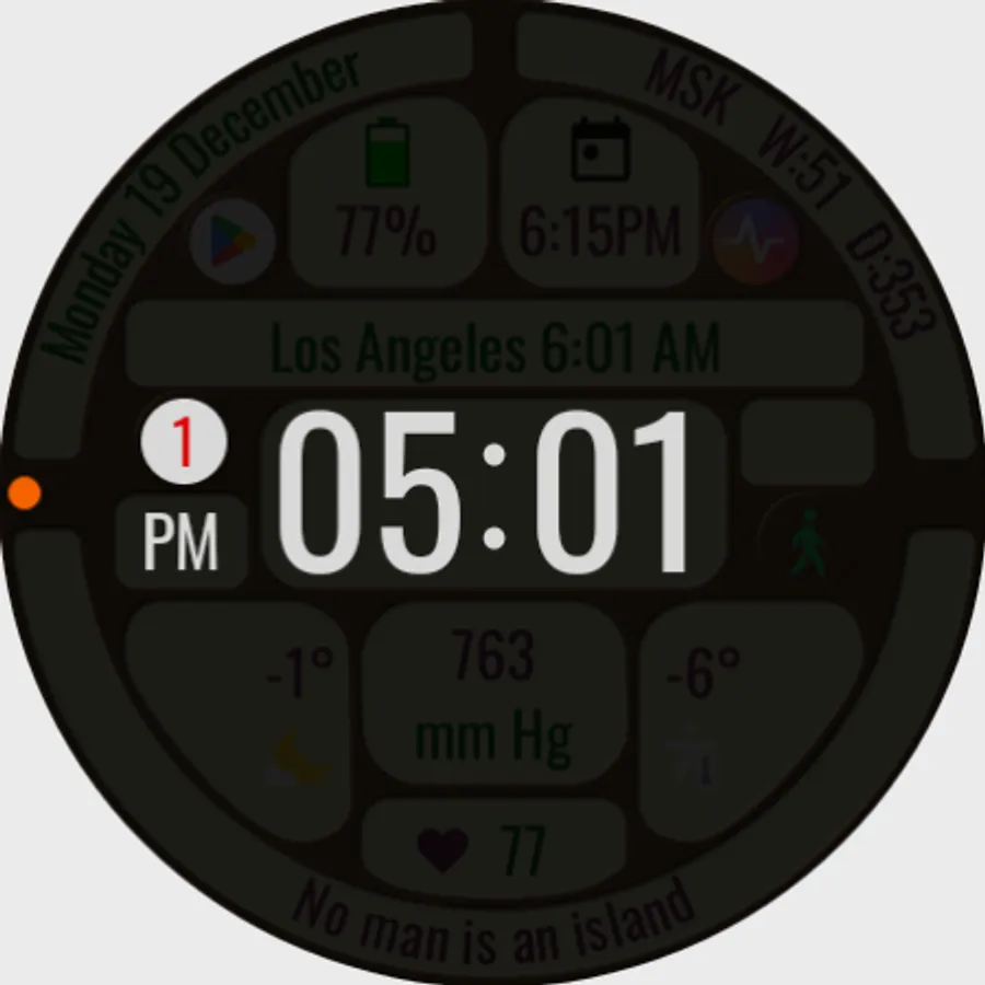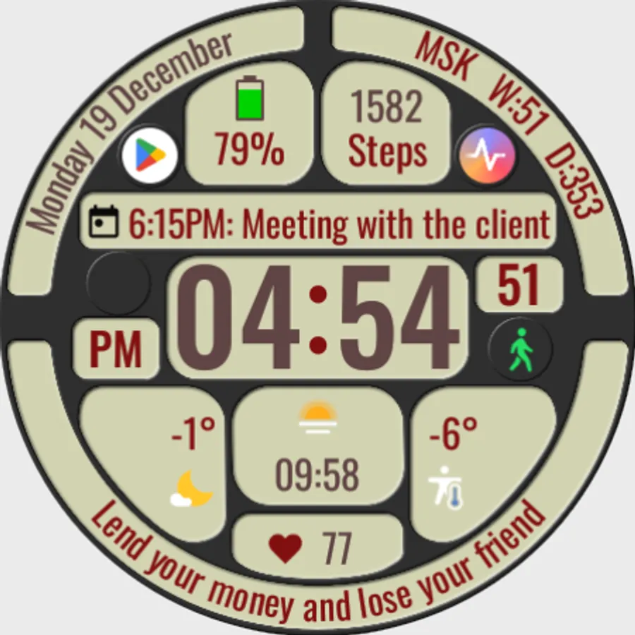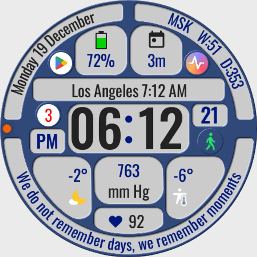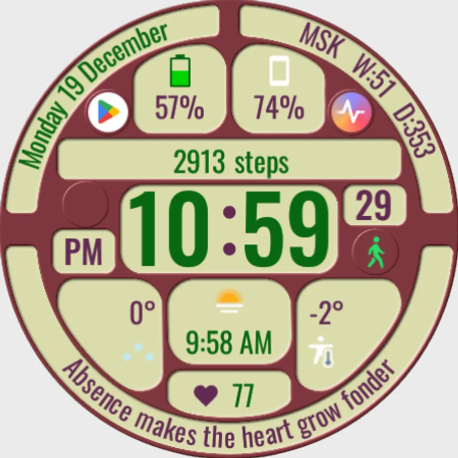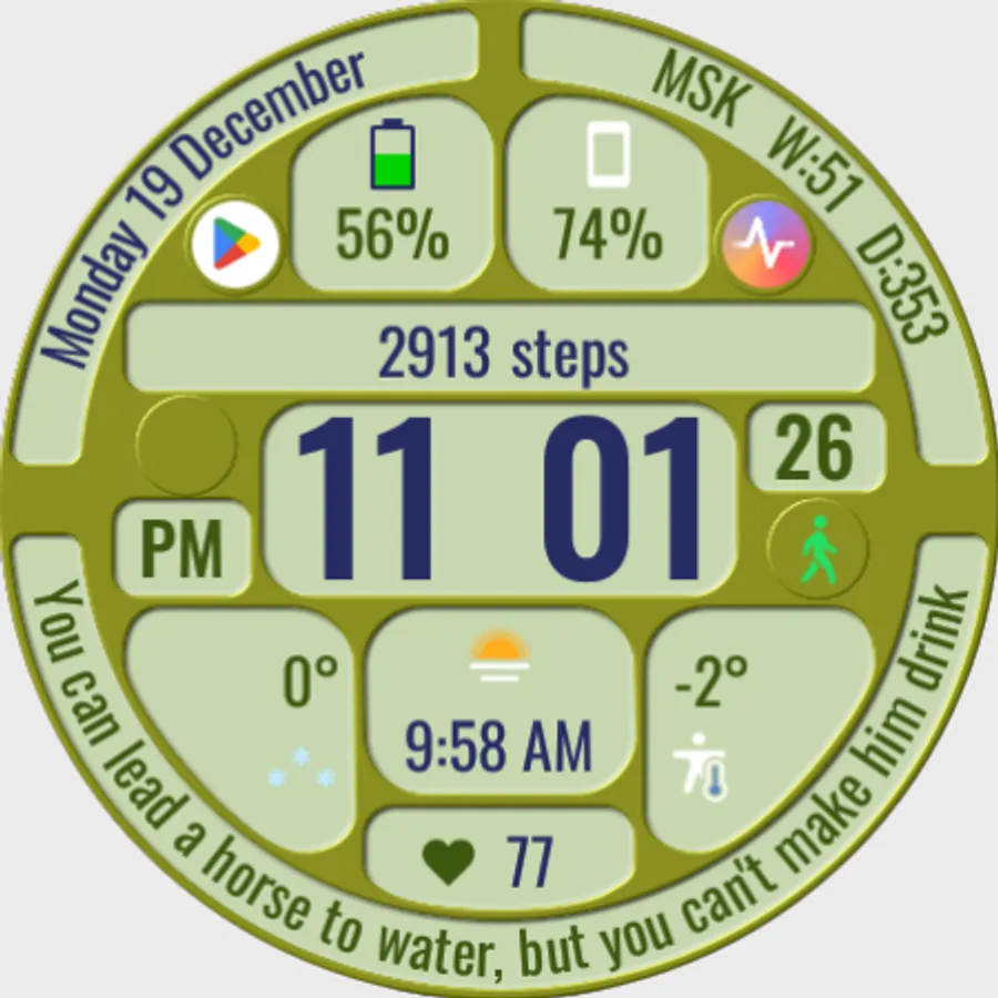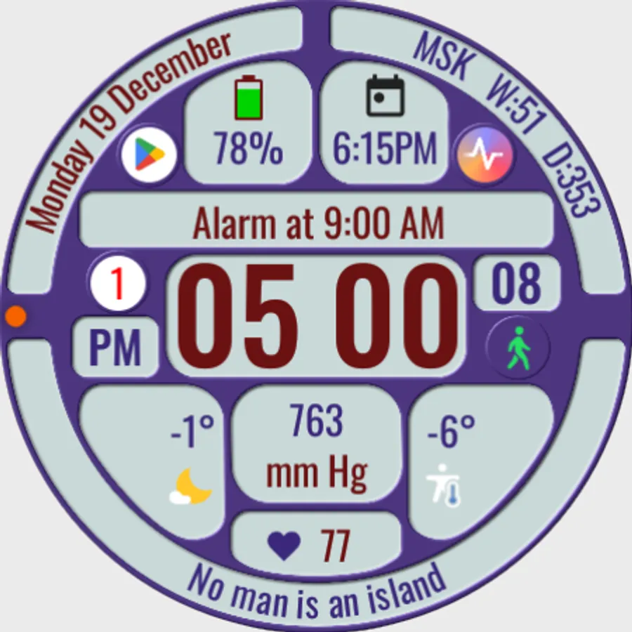 The watch face allows you to display a lot of useful information, is suitable for active and business people, and is also good during trips. It contains 144 abstruse phrases as an entertaining element, which will diversify your experience of using the watch face. Phrases in English.