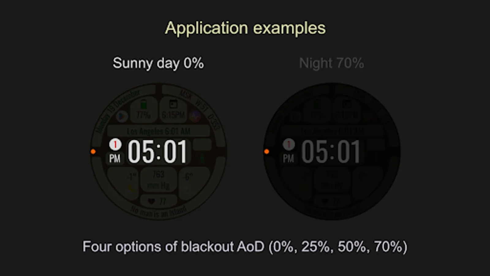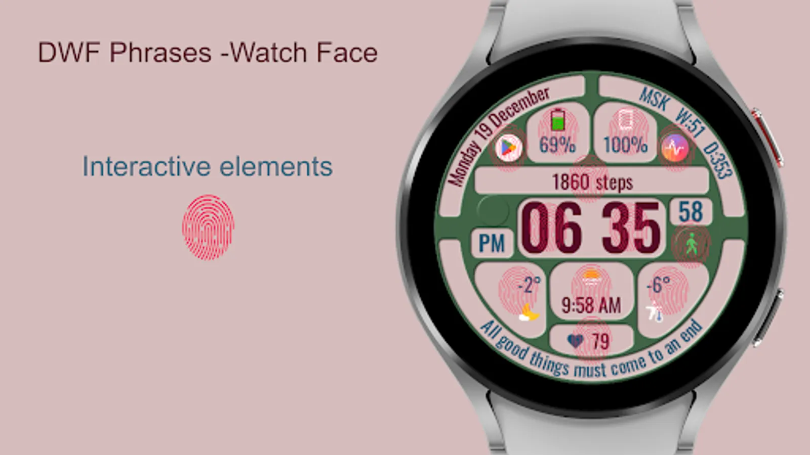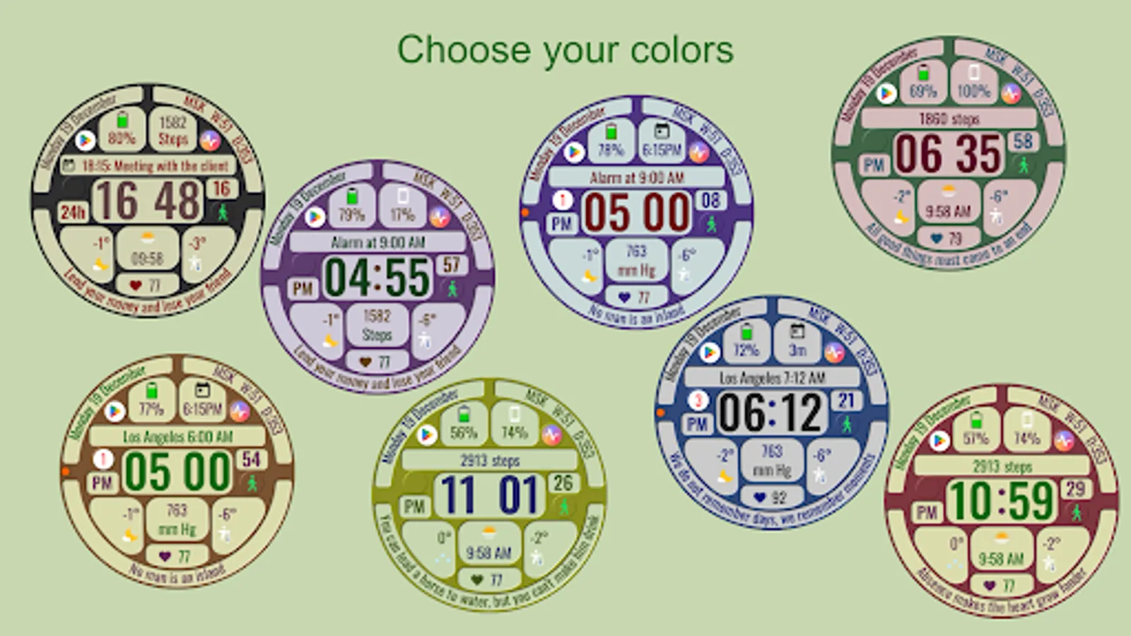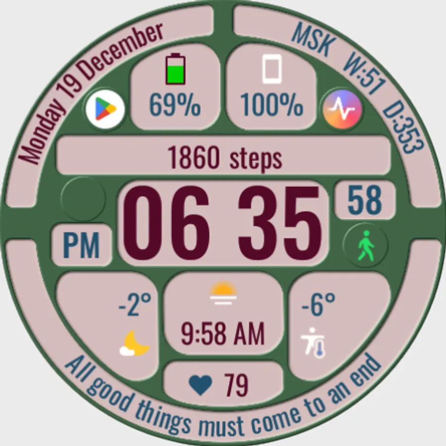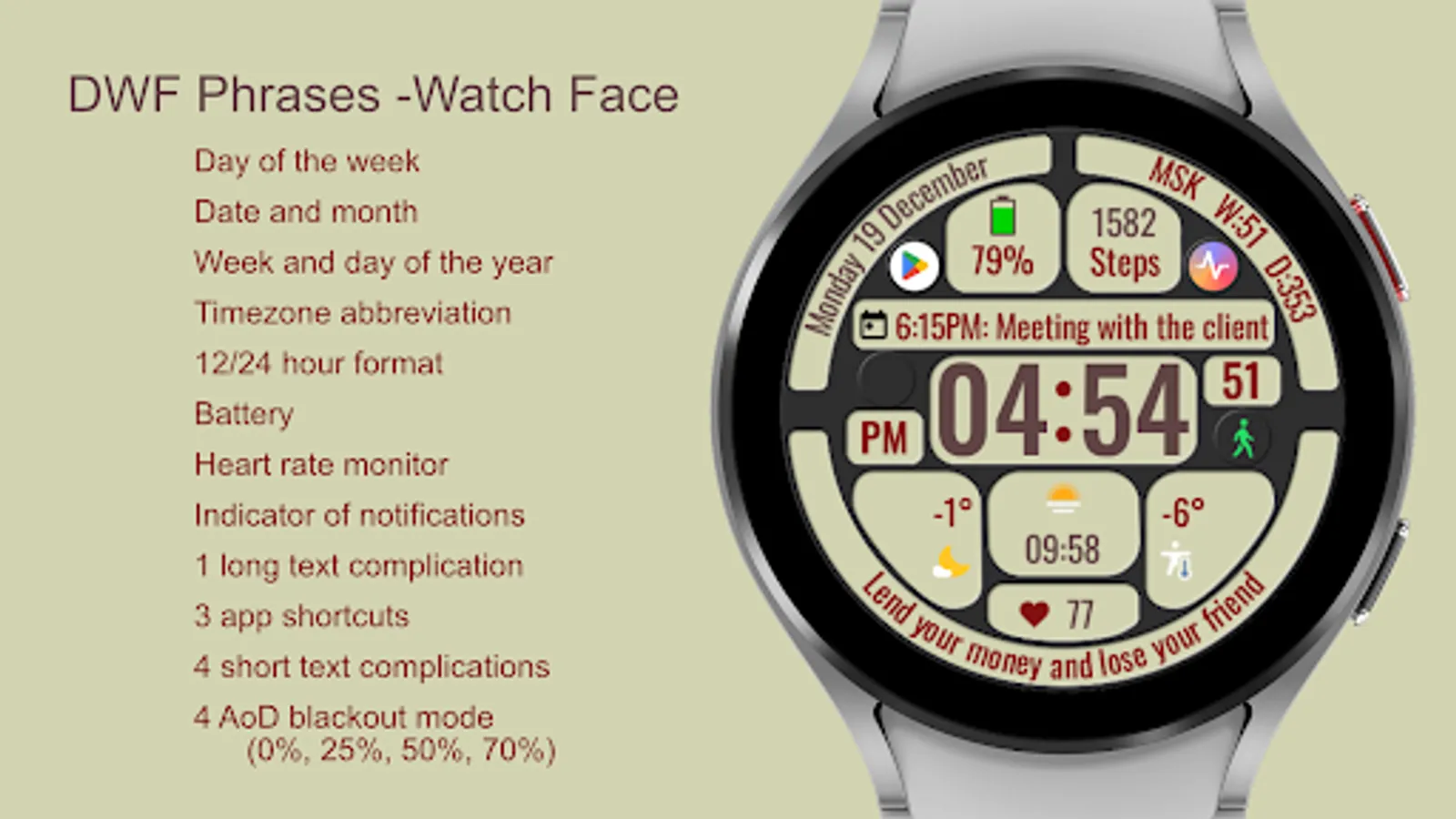 The watch face allows you to display a lot of useful information, is suitable for active and business people, and is also good during trips. It contains 144 abstruse phrases as an entertaining element, which will diversify your experience of using the watch face. Phrases in English.