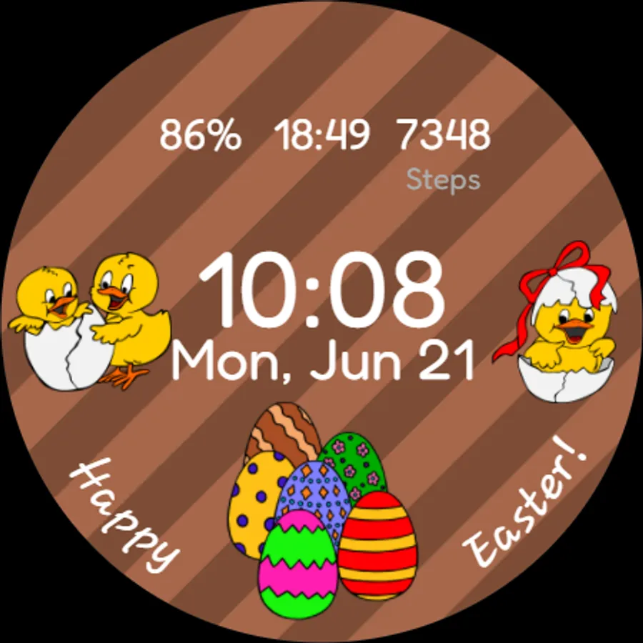 Easter Watchface is an app that provides a watchface for Wear OS devices. It can be configured to use up to 3 complications. Tap on a chicken at the side of the watchface or on the eggs in the bottom to switch it up a little!