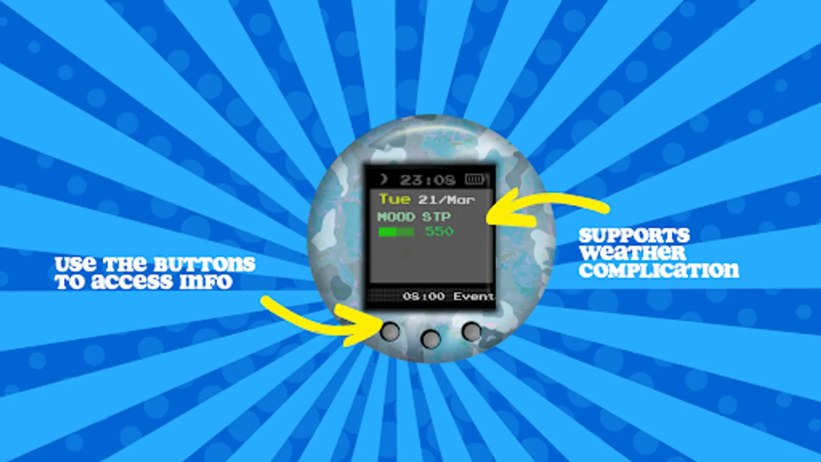 A blast from the past! Rediscover the 90s with your very own virtual pet watch face! Designed for WearOS 3 devices.