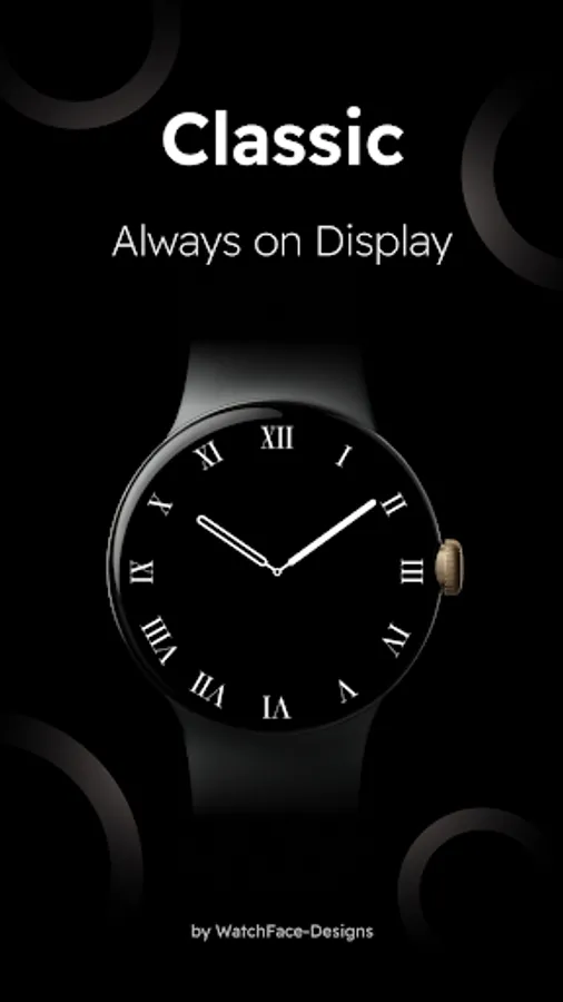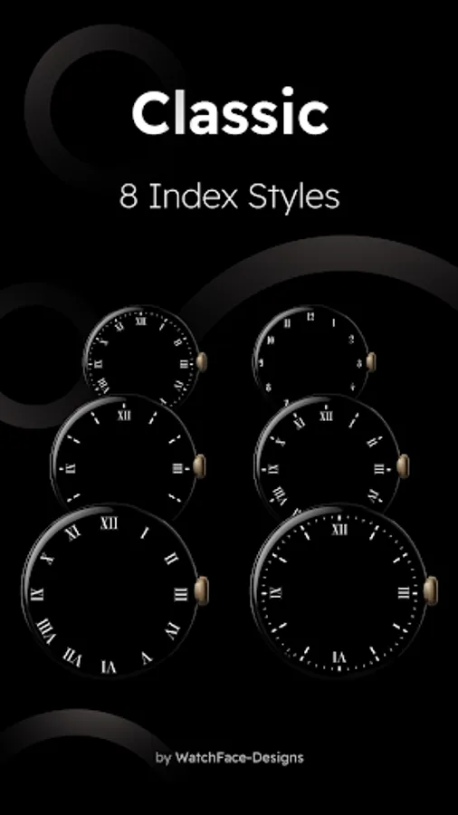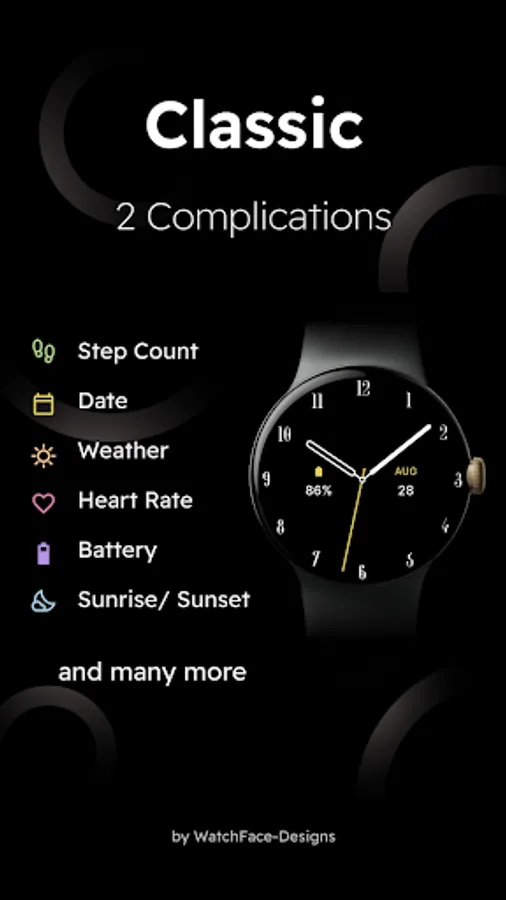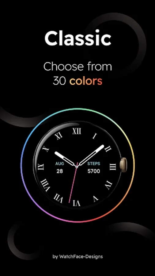 Classic is the perfect blend of minimalism and timeless style. You can choose from 30 different colors to match your personal style. With 8 index styles you can find the perfect look for your watch. With 2 customizable complications information like date, weather, etc. is available to you at a glance. The watch face also supports 2 Always on Display modes.