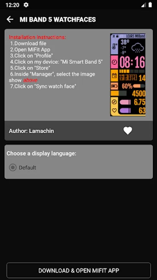 + When you click into an image, popup a detail layout will appear. You can set wallpaper, or set favorites to save your favorite mi band 5 watchfaces to your own collection.