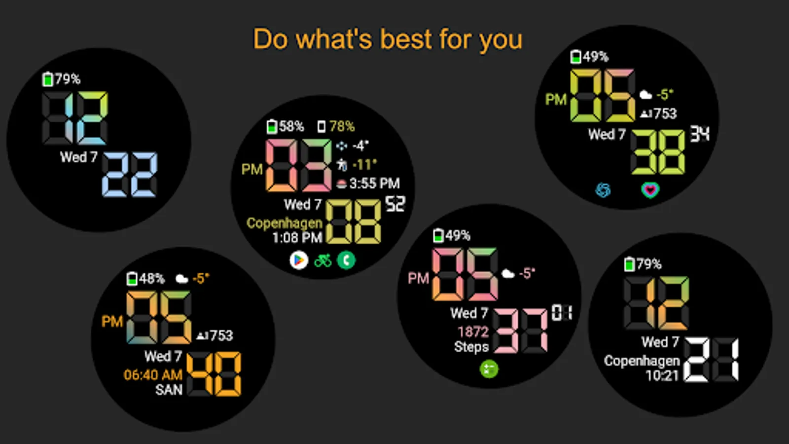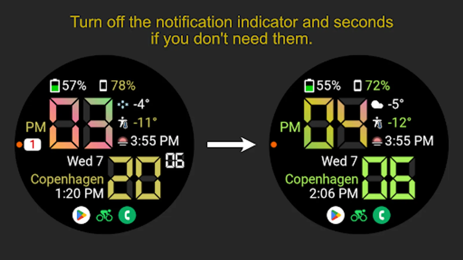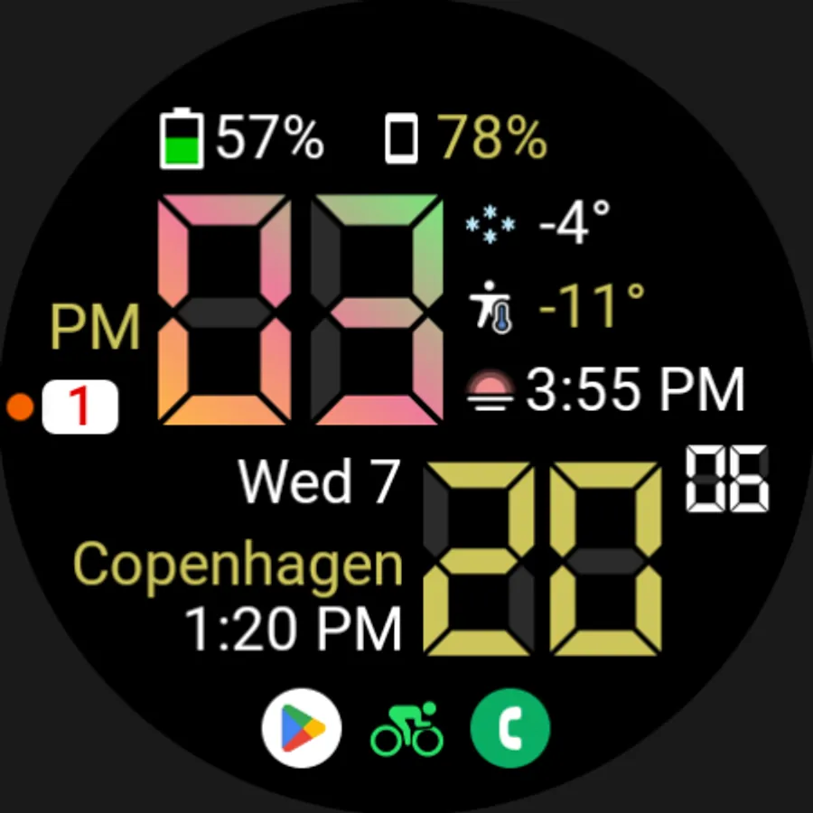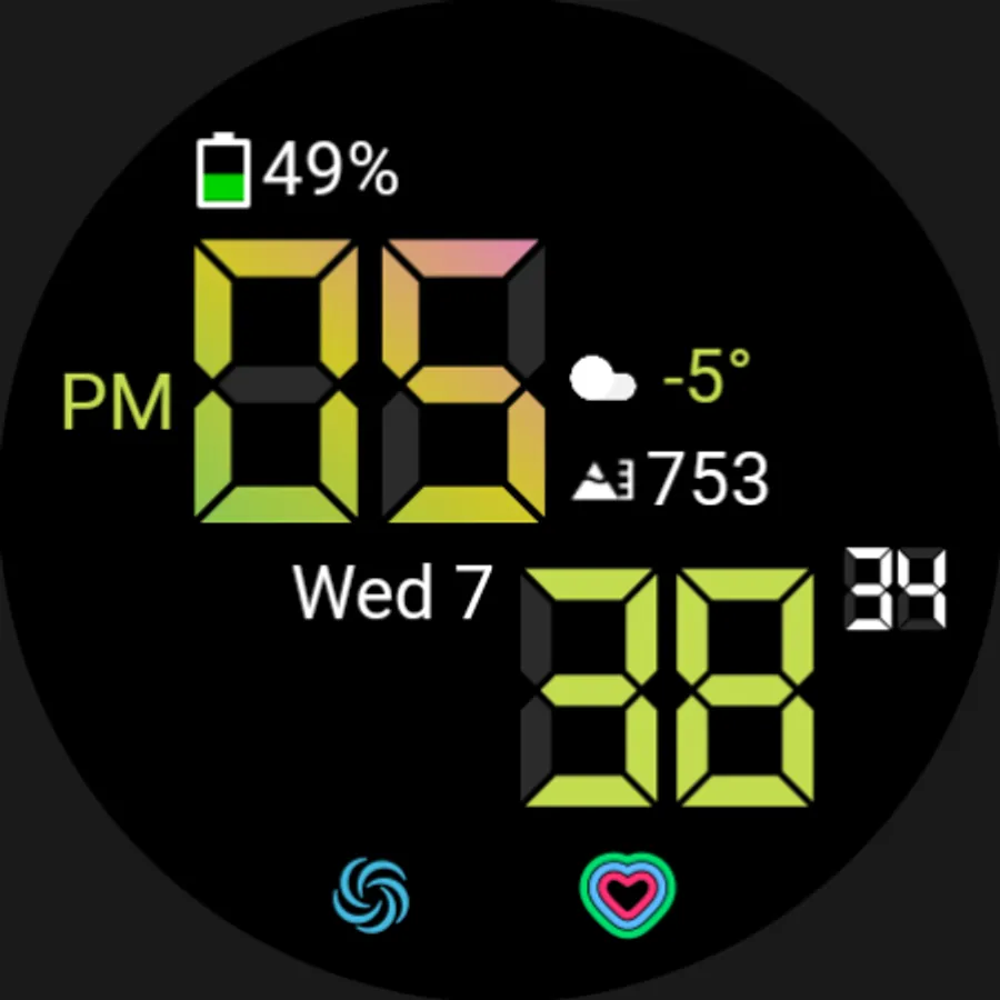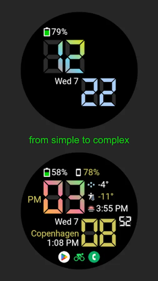 A watch face for all occasions. It is easily transformed from the simplest to the most filled with useful information.