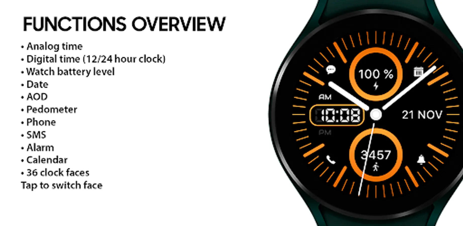 36 color themes (tap to switch), All languages, Analog time, Digital time (12/24 hour clock), Watch battery level, Date, AOD, Pedometer, Alarm, Calendar, SMS, Phone
