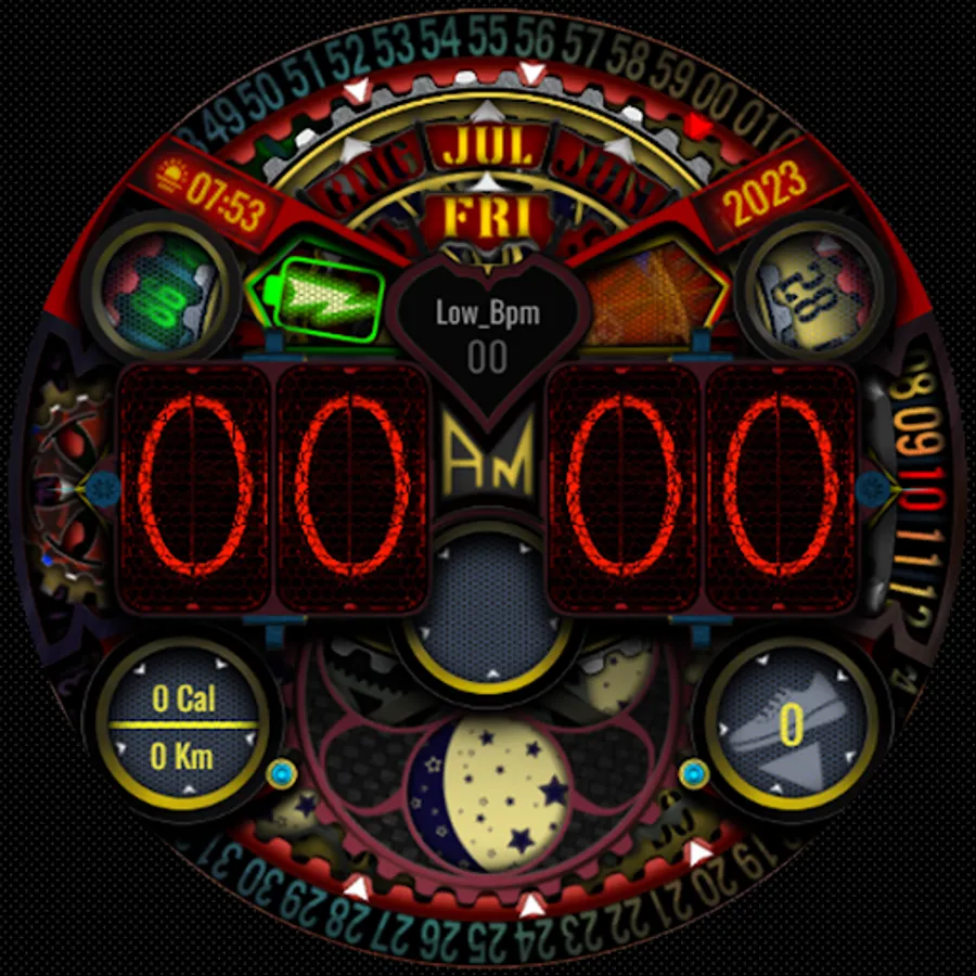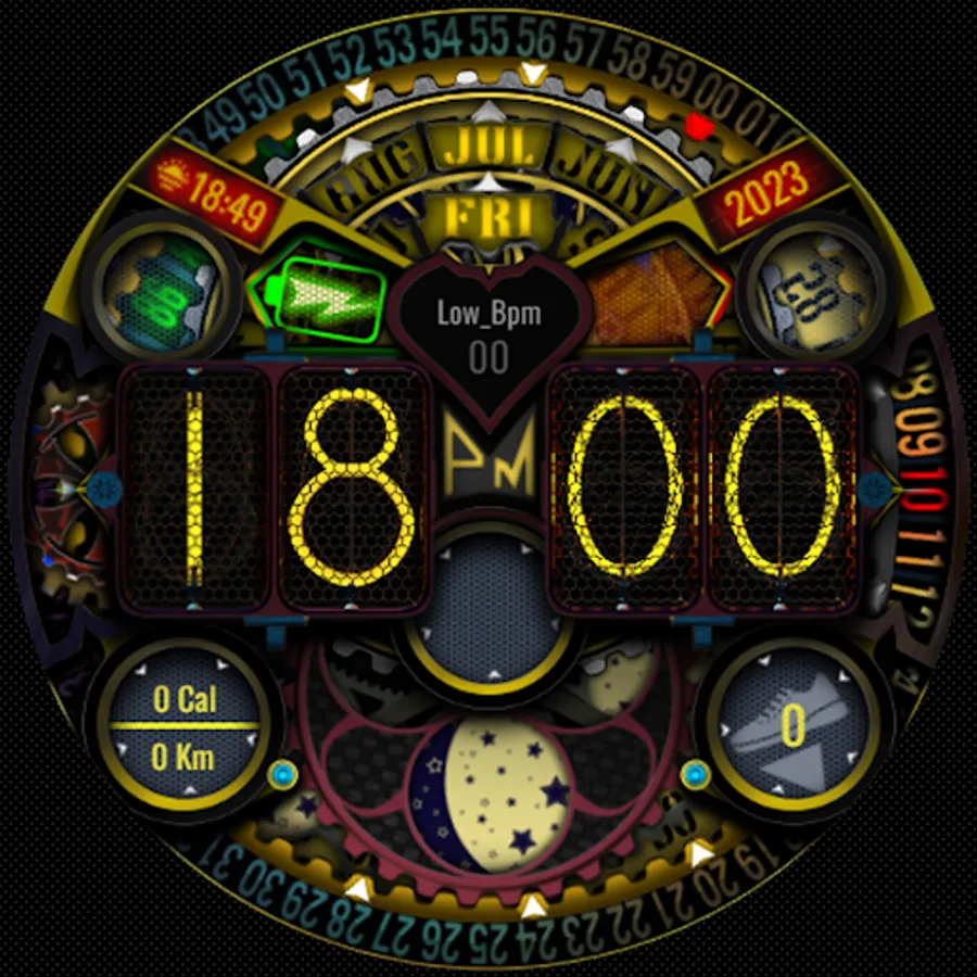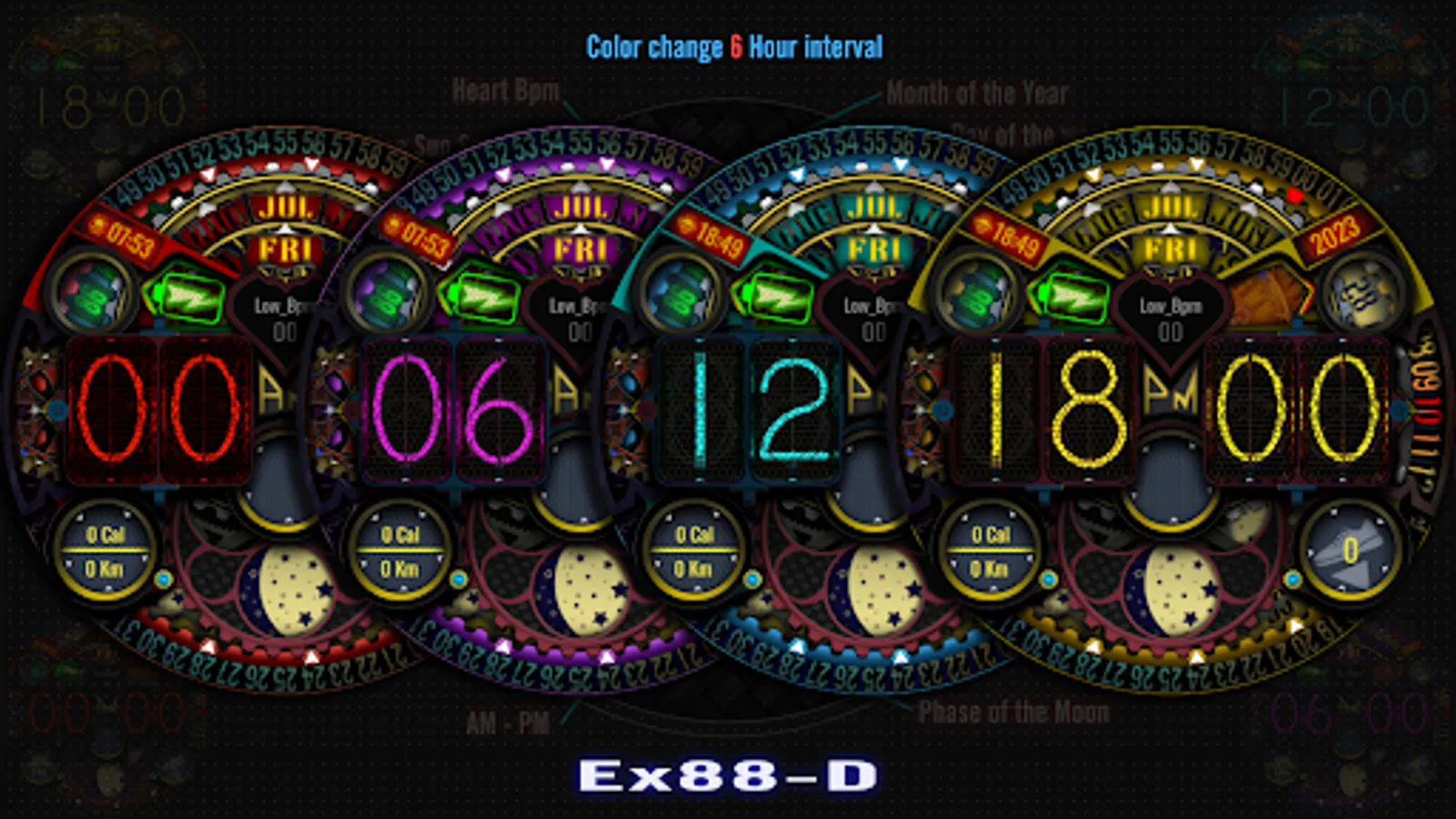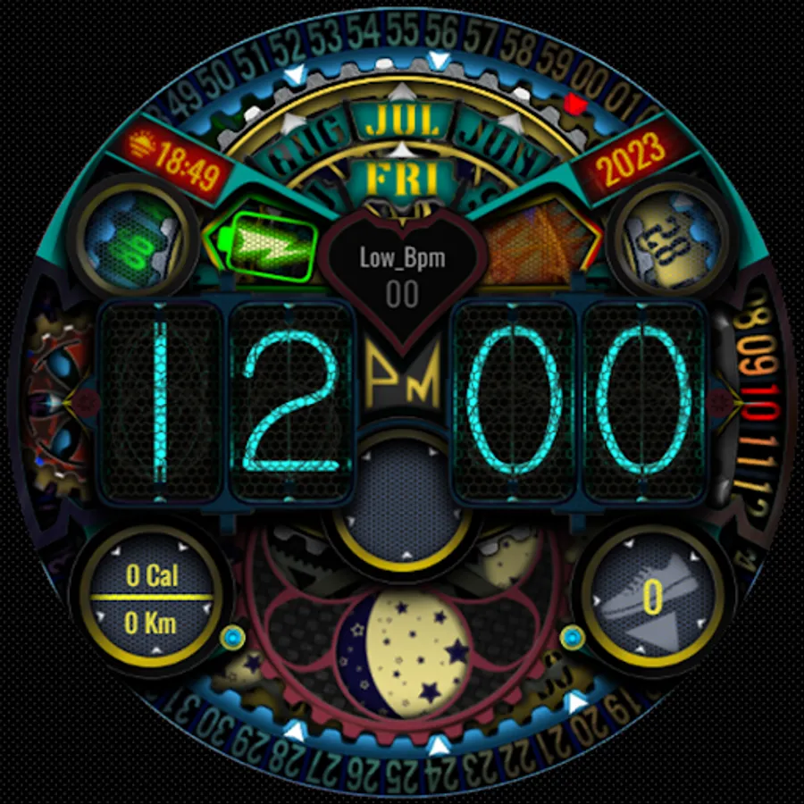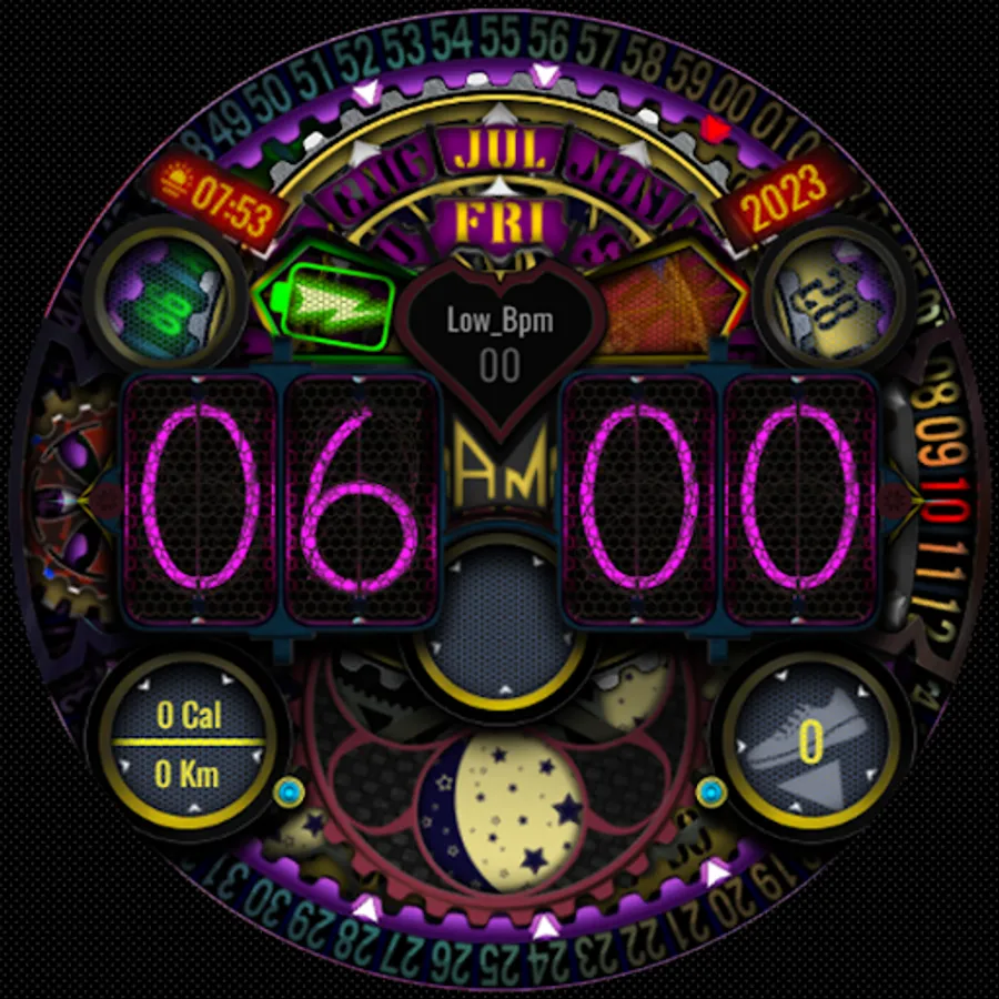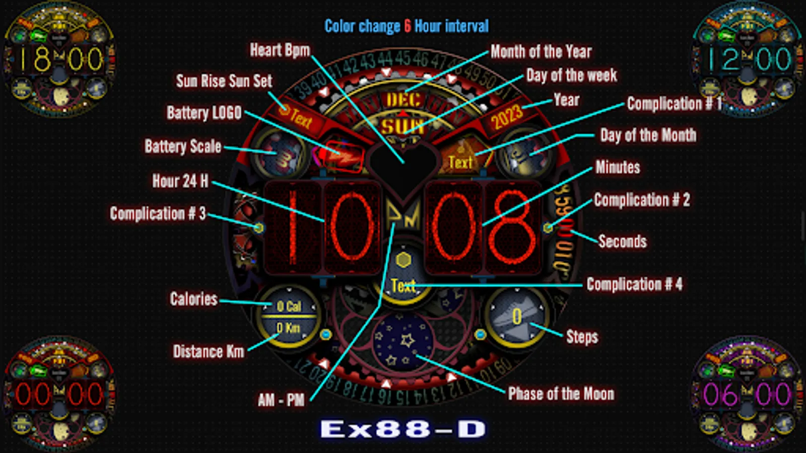 This is a Watch face for Watch Face OS Galaxy, Watch model 4, model 5 and other android watches. The type is a Dynamic Mechanic watch face that changes color 6 hours interval .