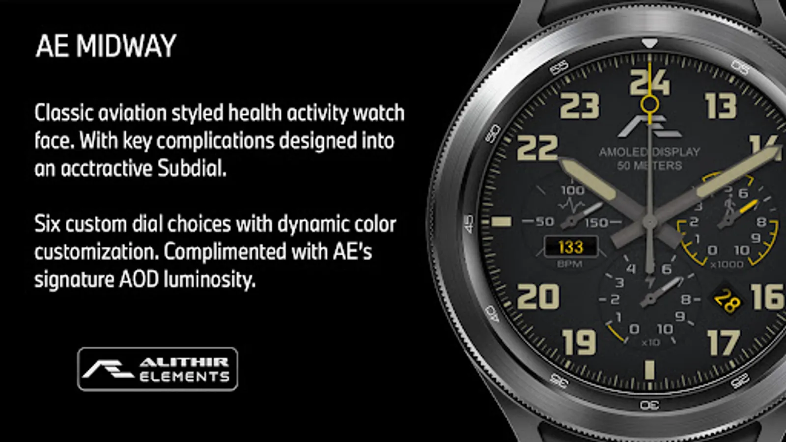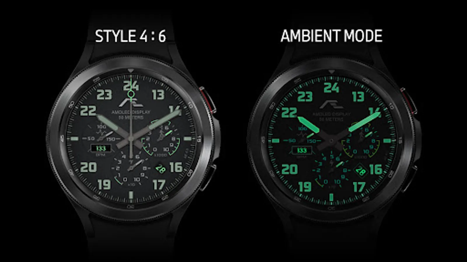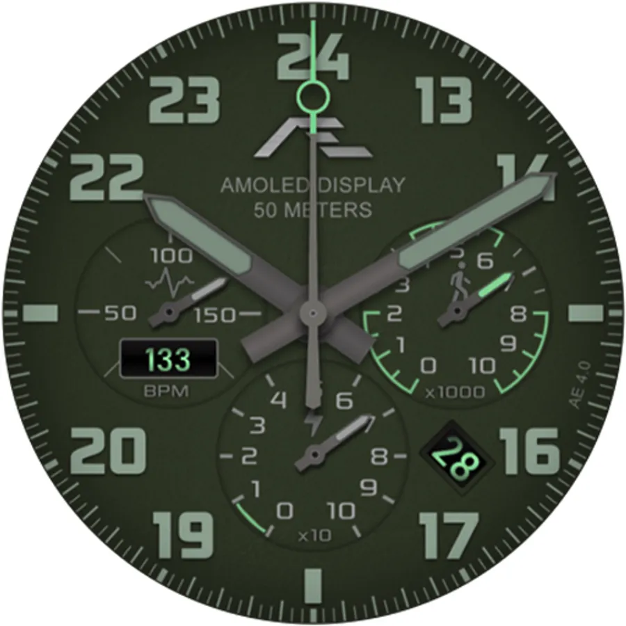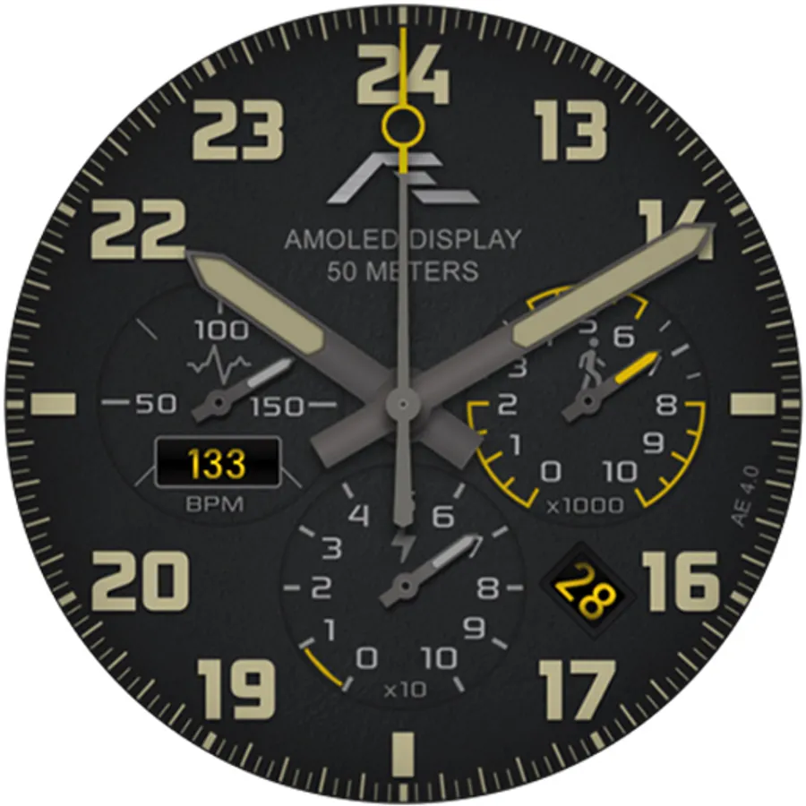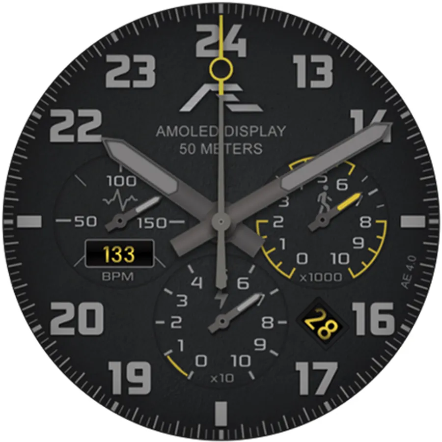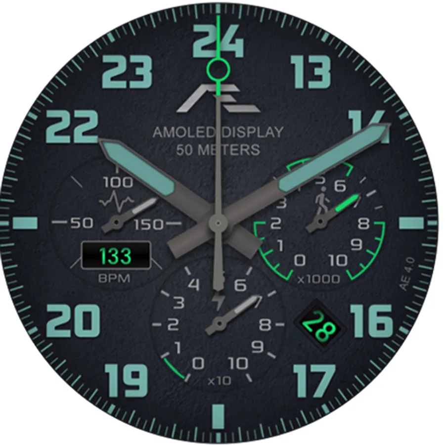 Classic, aviation-styled health activity watch face. Key activity complications integrated into a realistic Subdial rendition. Six dial choices and dynamic color customization, sheer work of art that comes with AE’s signature Always ON Display (AOD) luminosity.