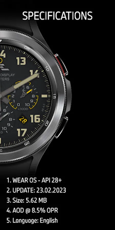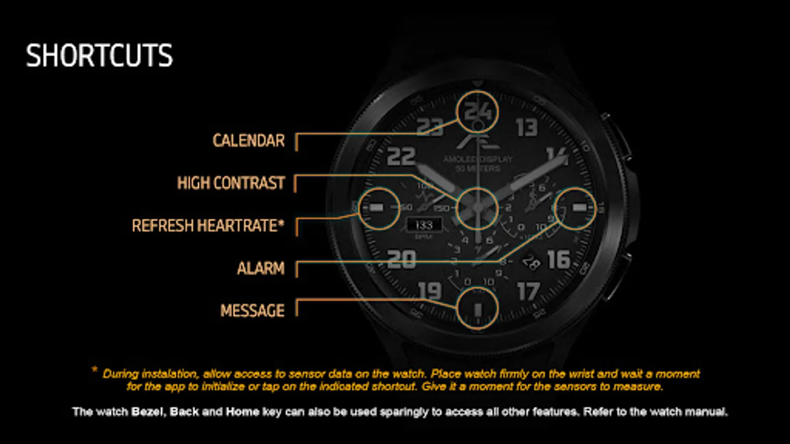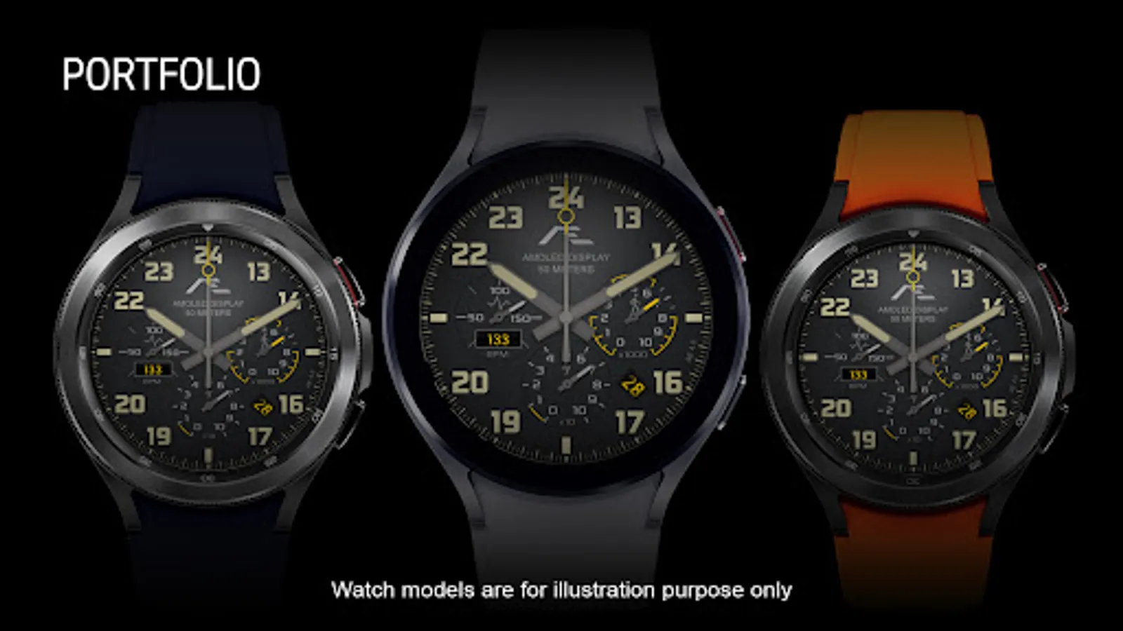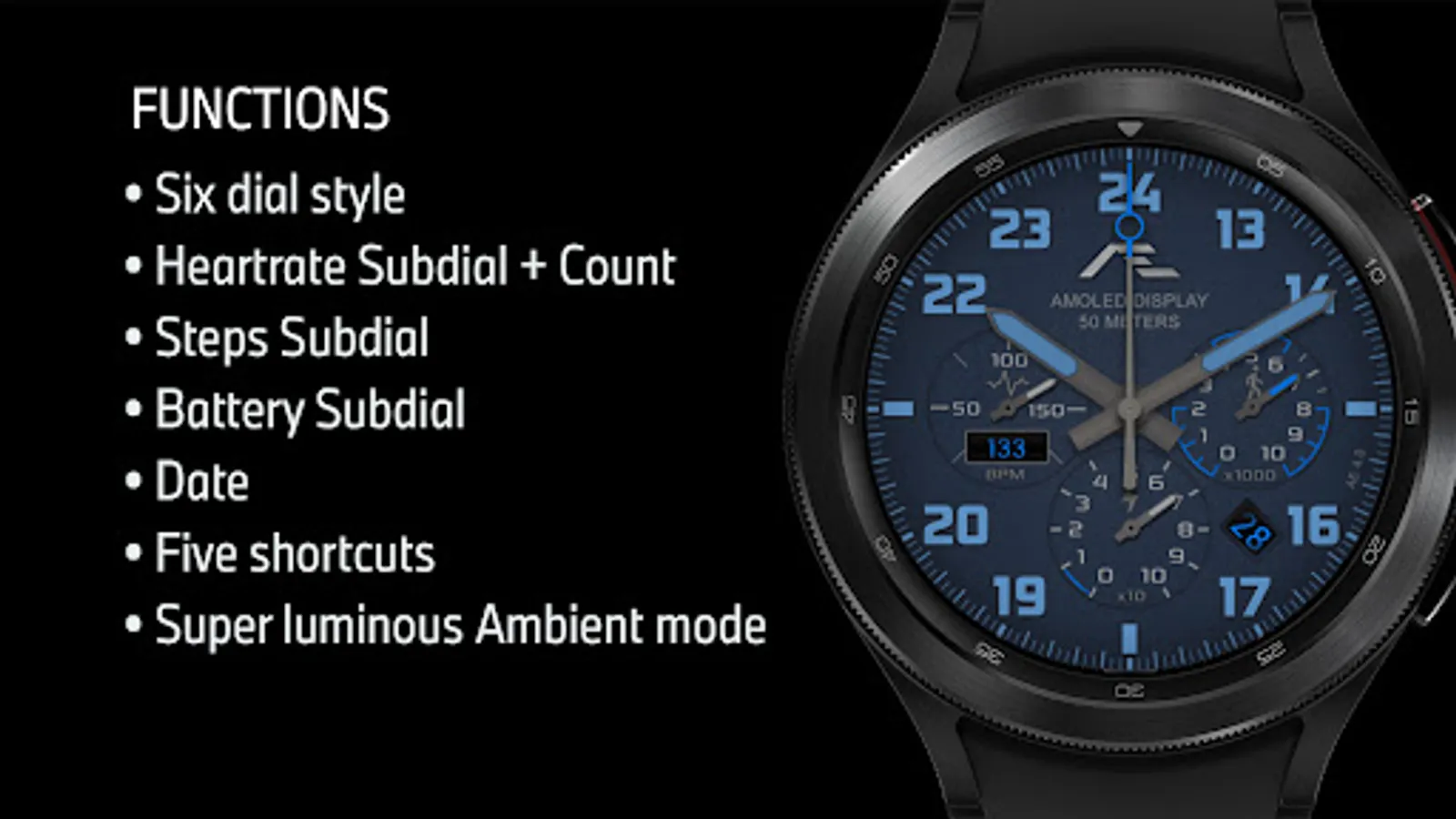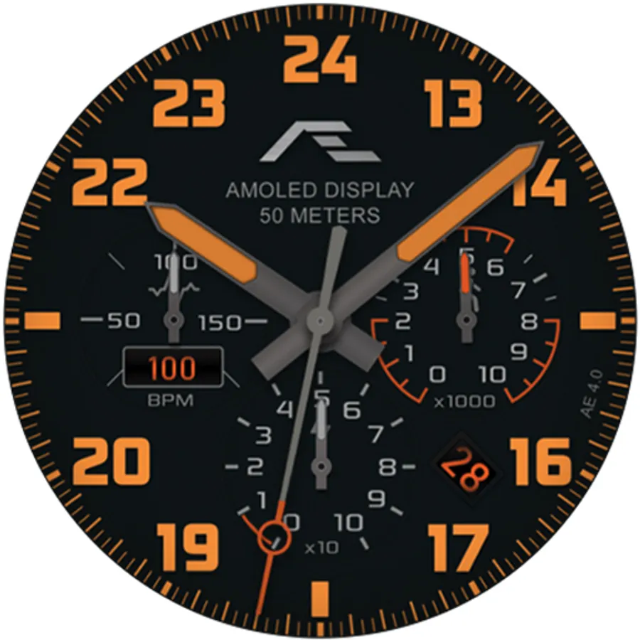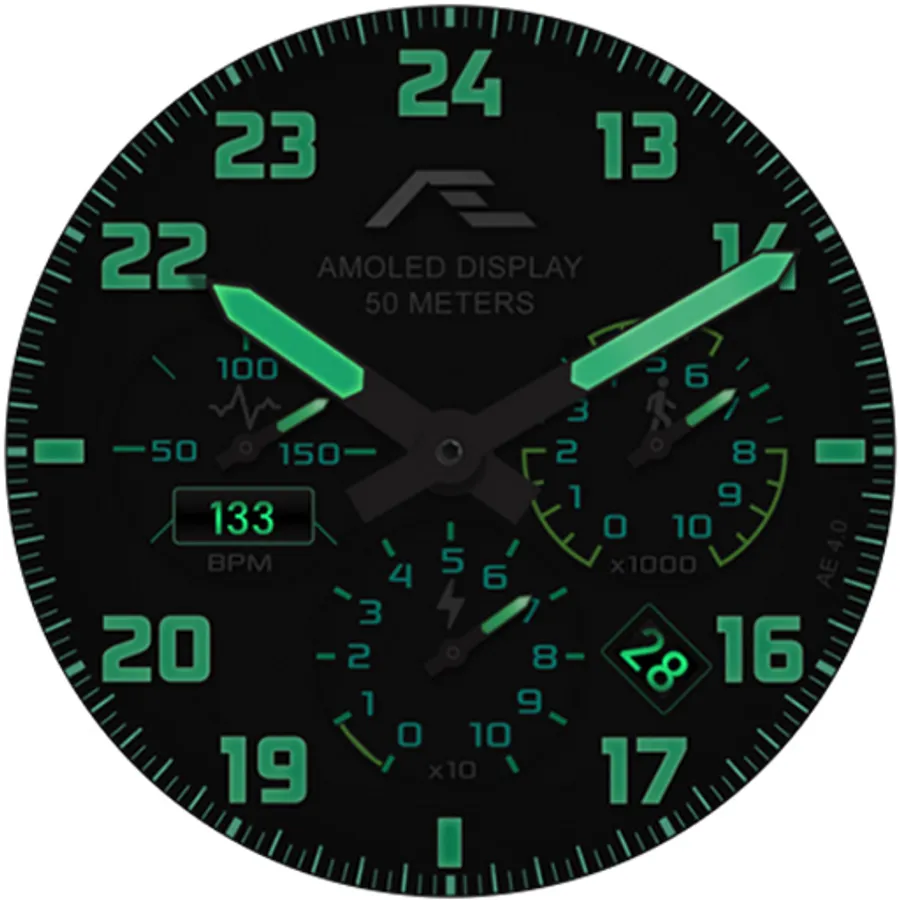 Classic, aviation-styled health activity watch face. Key activity complications integrated into a realistic Subdial rendition. Six dial choices and dynamic color customization, sheer work of art that comes with AE’s signature Always ON Display (AOD) luminosity.