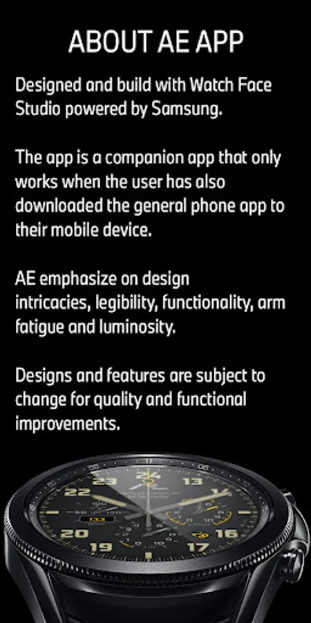 Alithir Elements holds the responsibility for the design, functions, features, and quality of this App, tested on Samsung Tizen and Wear OS watches, all features and functions worked as intended. The same may not apply to other Wear OS devices. The app is subject to update/s for quality and functional improvements.