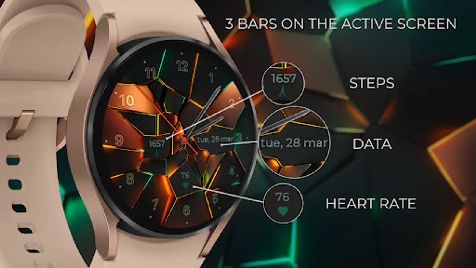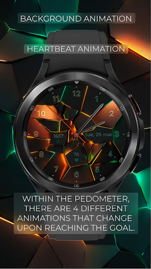 The unique NeonShatter watch face for Wear OS (API level 28+) will make your everyday life brighter and more exciting. It offers a dynamic design that creates a shattering effect with a looping animation of shards on the background and bright neon highlights on their edges. This design catches the eye and allows your watch to stand out from the rest.