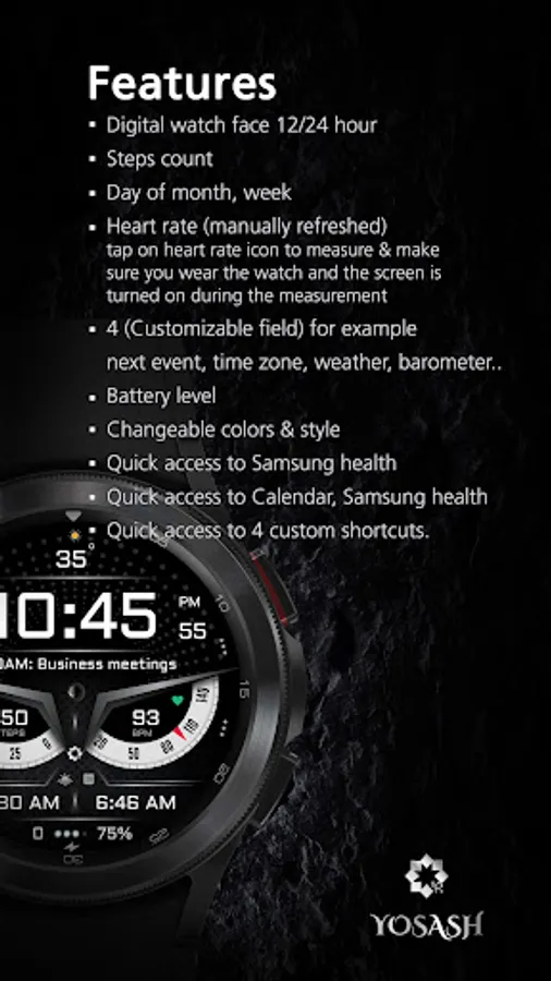 - Digital watch face switchable to 12/24 hour via Phone Settings