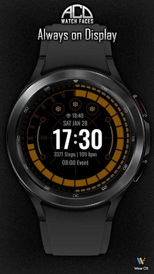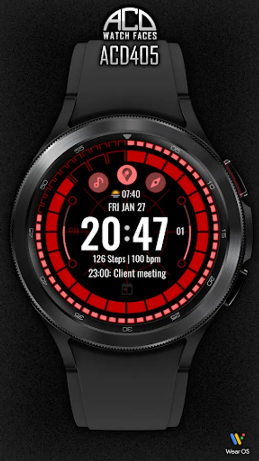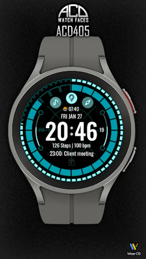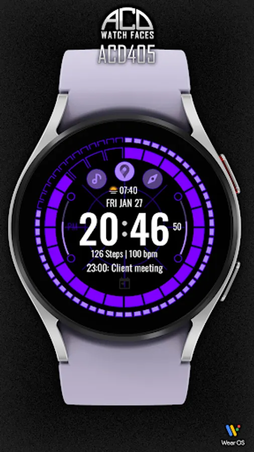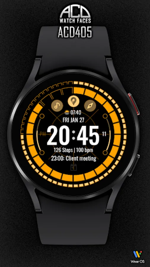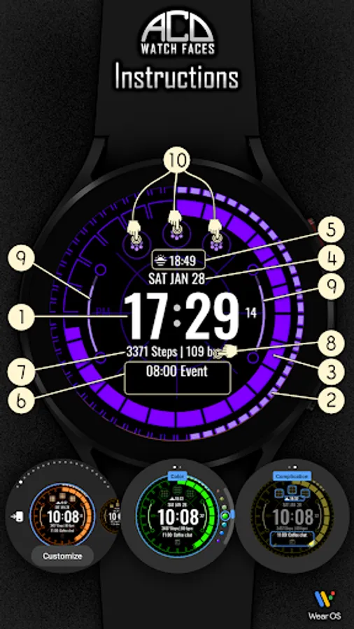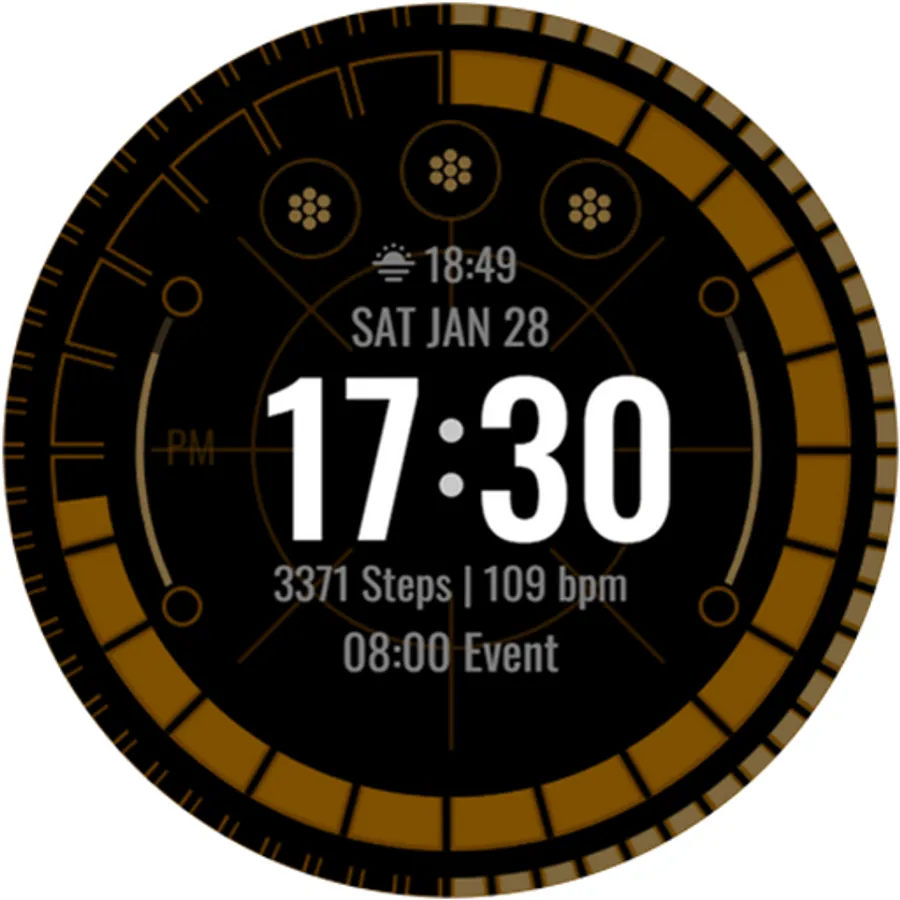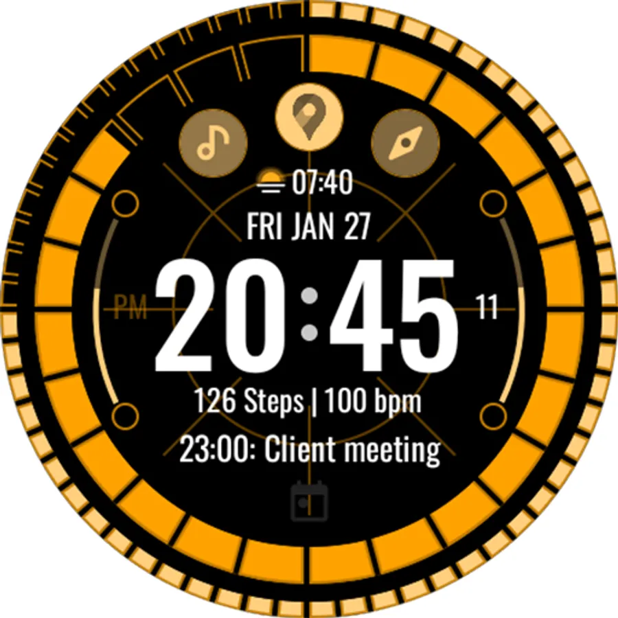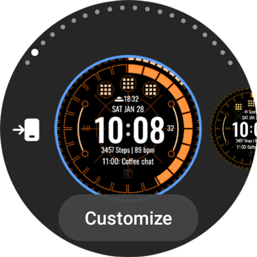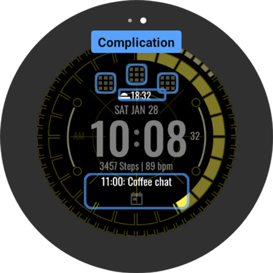 6. Customizable info, default: Next calendar event. It can be changed in the customization menu. Some Info options may not display correctly depending on the watch model or information selection.