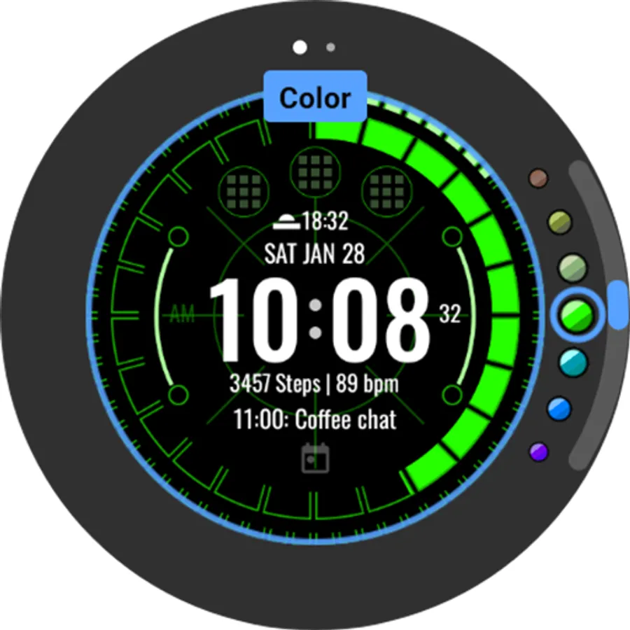 Digital watch face with 3 customizable shortcuts and several color combinations.