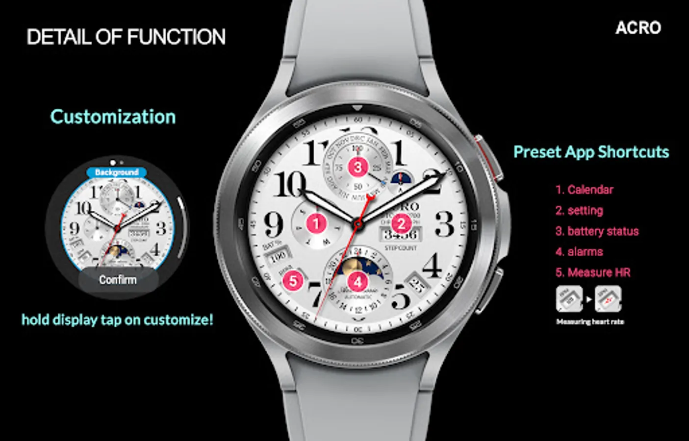 1. Press and hold the watch face > 2. Click the Decorate button > 3. Tap each complication area to set the corresponding information > 4. Click OK