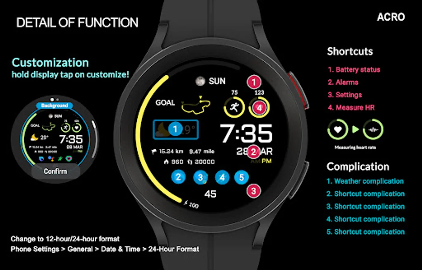 1. Press and hold the watch face > 2. Click the Decorate button > 3. Tap each complication area to set the corresponding information > 4. Click OK