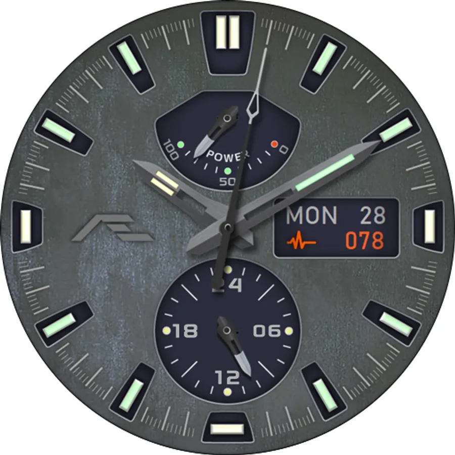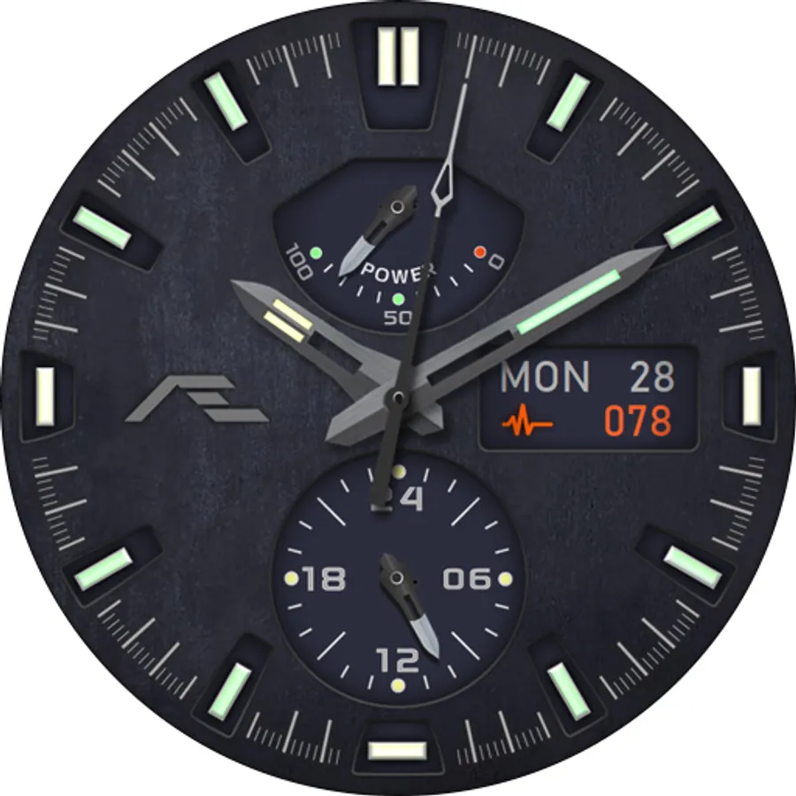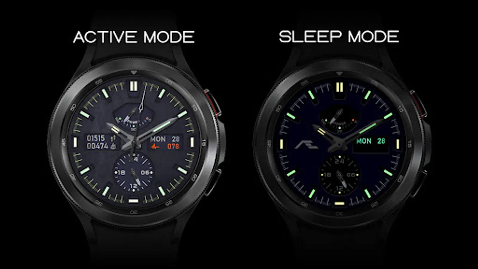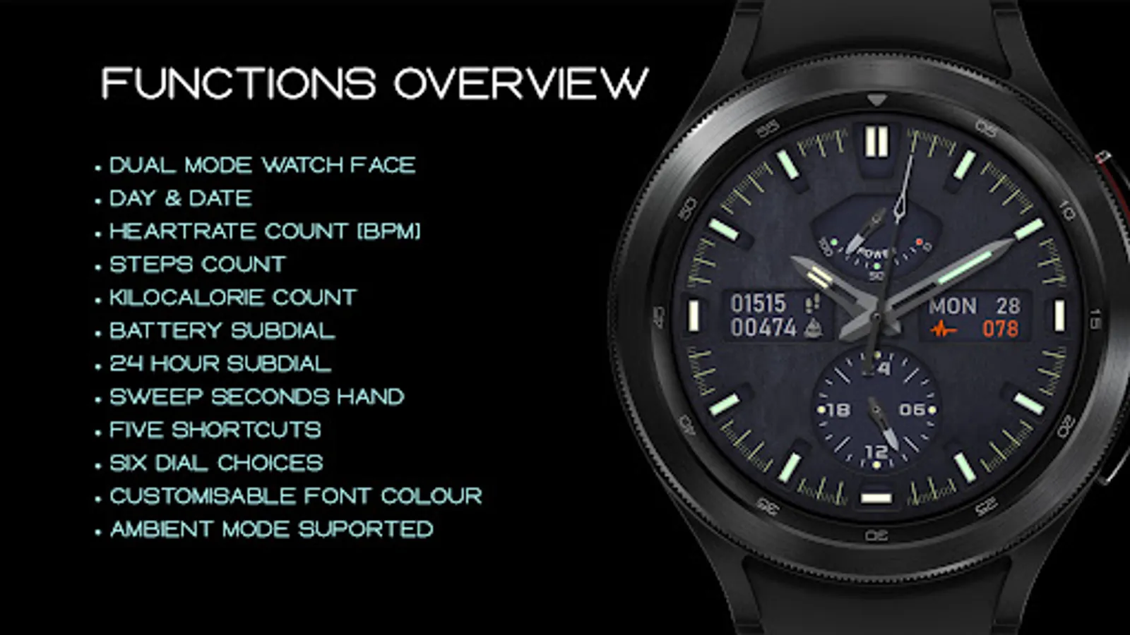 Naval inspired, tactical styled dual mode designer watch face. The dual mode, also known as 2 in 1 concept, shows or hides the Step and Kilocalorie counts. A darkened yet super luminous AOD that makes it equally stunning as the main dial. Six dial choices with customizable font colors.