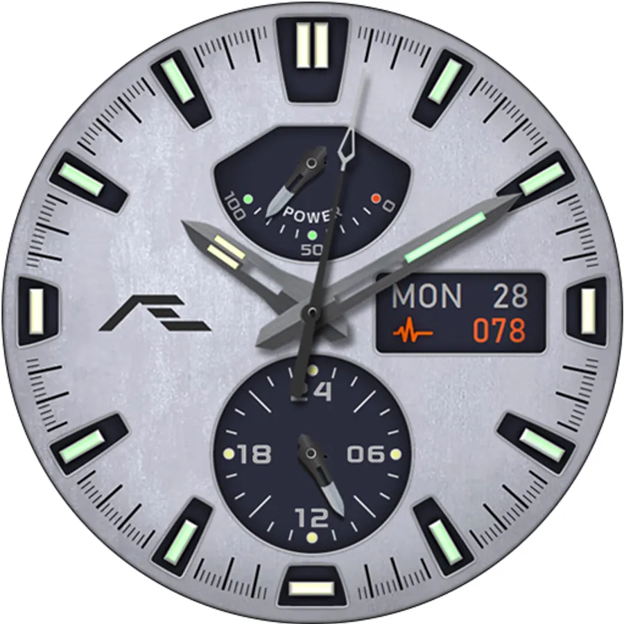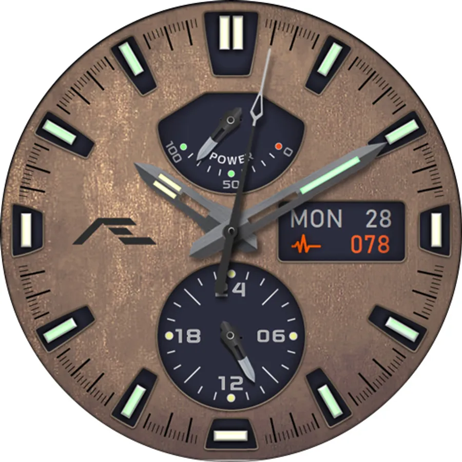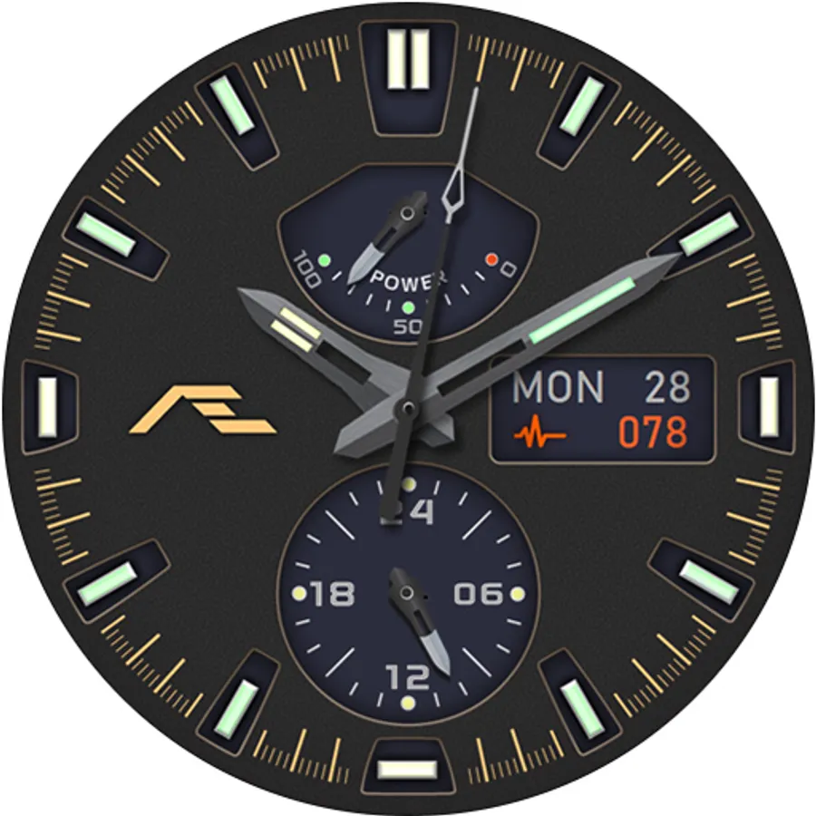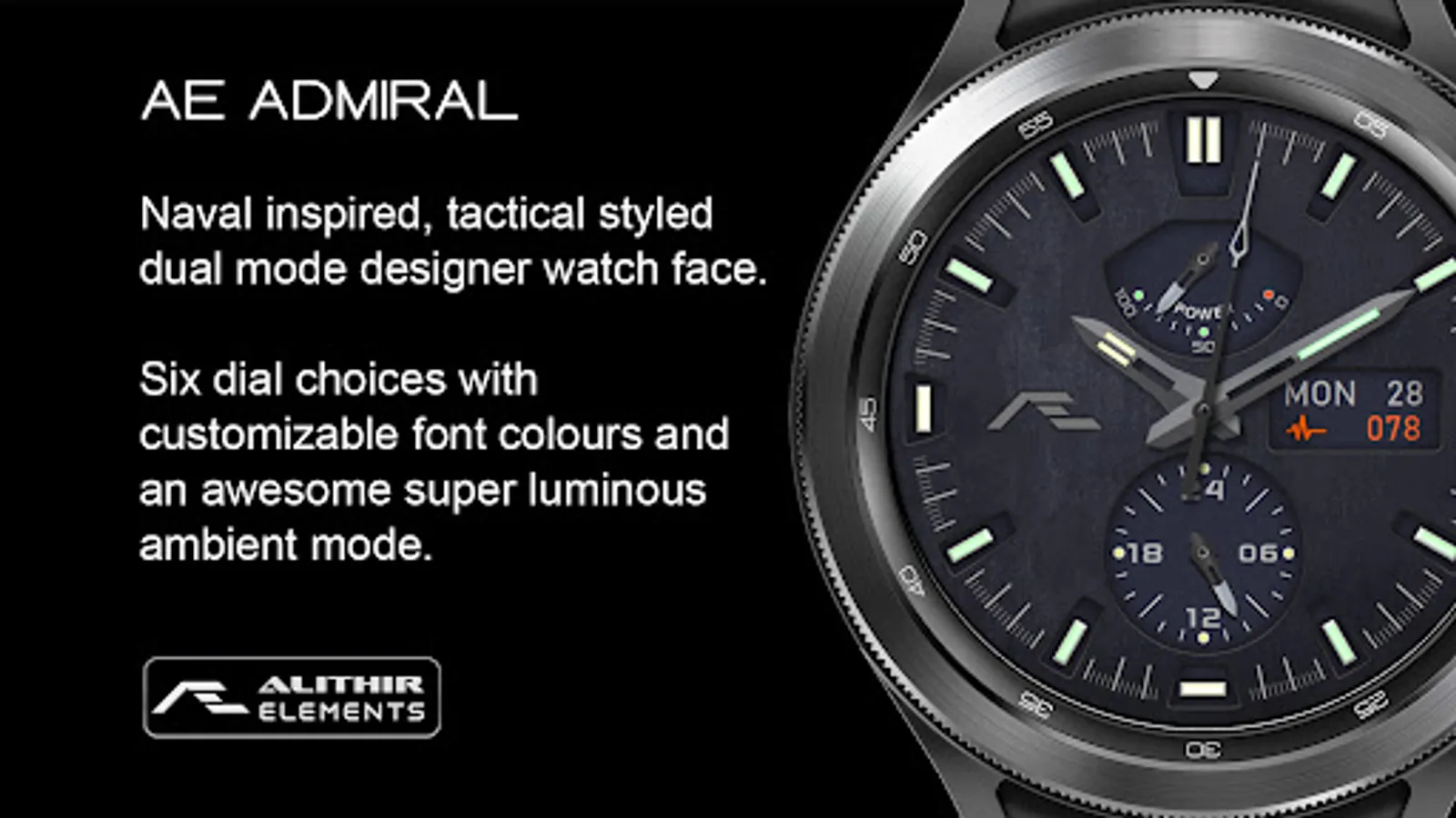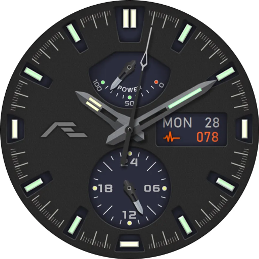 Naval inspired, tactical styled dual mode designer watch face. The dual mode, also known as 2 in 1 concept, shows or hides the Step and Kilocalorie counts. A darkened yet super luminous AOD that makes it equally stunning as the main dial. Six dial choices with customizable font colors.