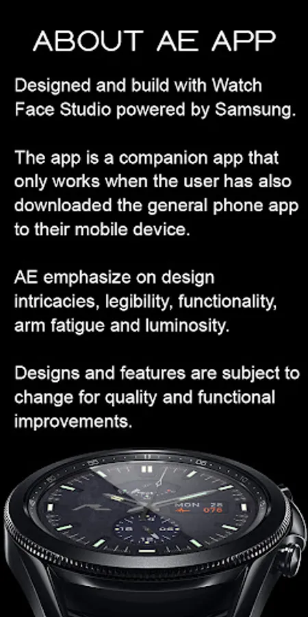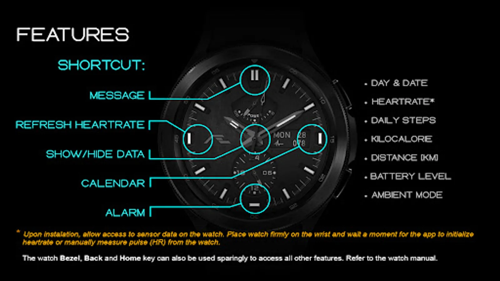 Build with Watch Face Studio powered by Samsung. Customizable data font colors via phone companion App. Tested on Samsung Watch 4 Classic and all features and functions worked as intended. The same may not apply with other Wear OS devices.