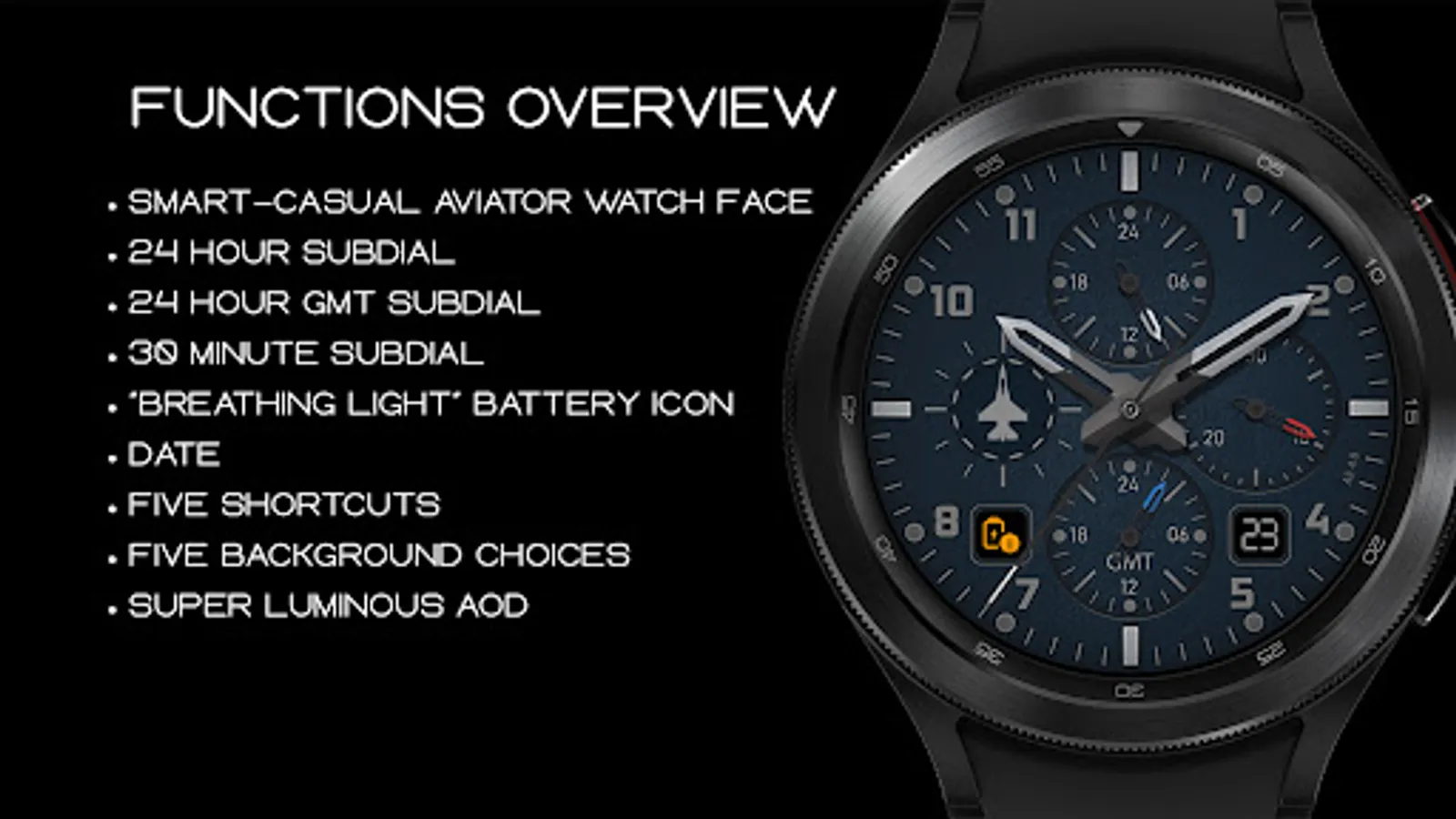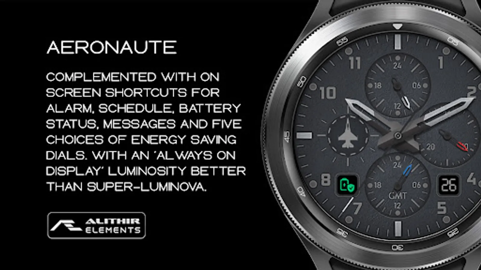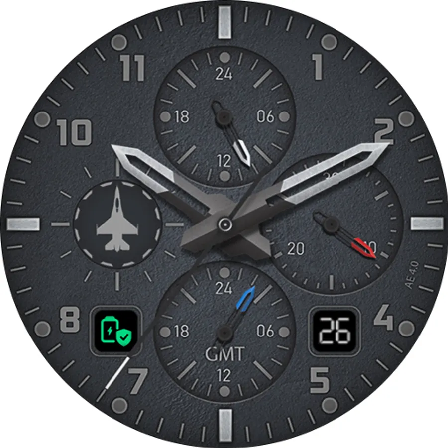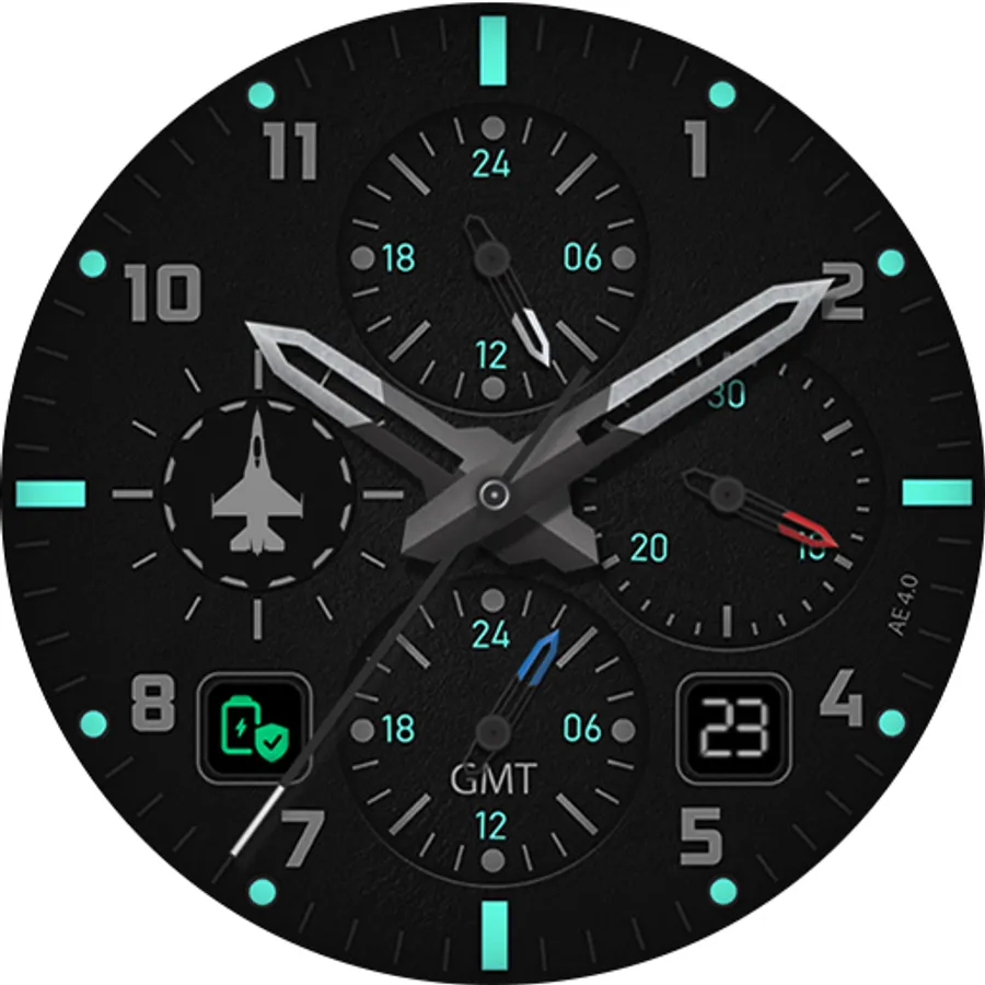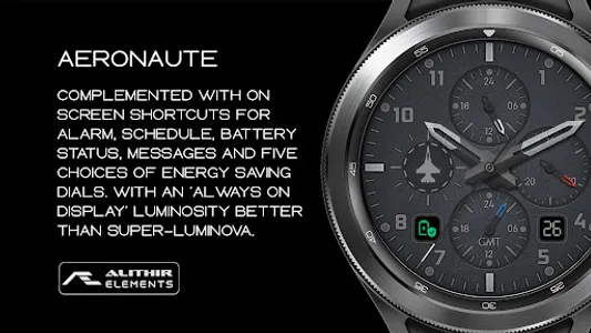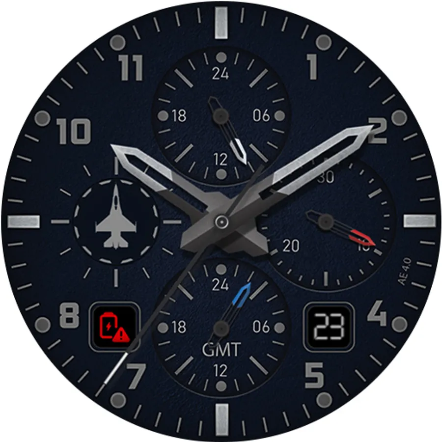 An aviation inspired, exclusively designer watch face. Five choices of energy saving background with an awesome Always ON Display - luminosity better than Super-Luminova.