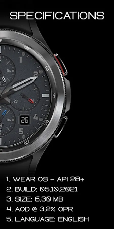 Build with Watch Face Studio powered by Samsung. Non-customizable, exclusively designer watch face. The App has been tested on Samsung Watch 4 Classic and all features and functions worked as intended. The same may not apply with other Wear OS devices.